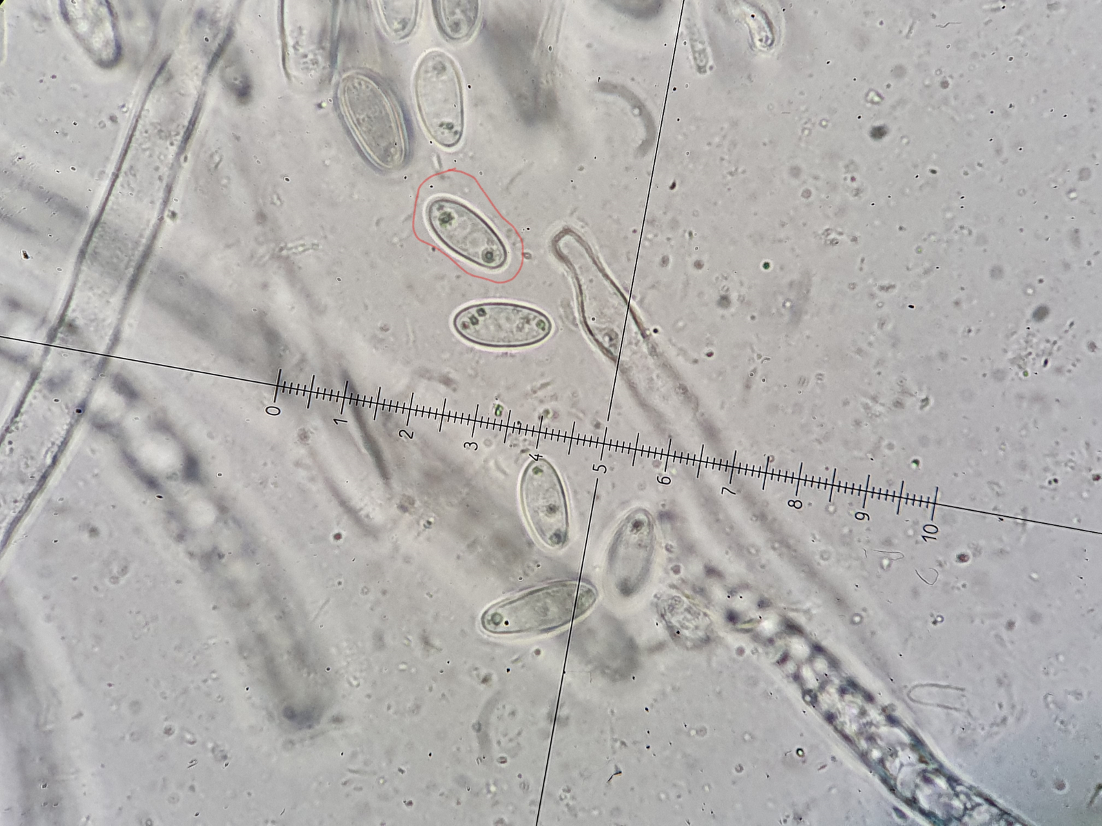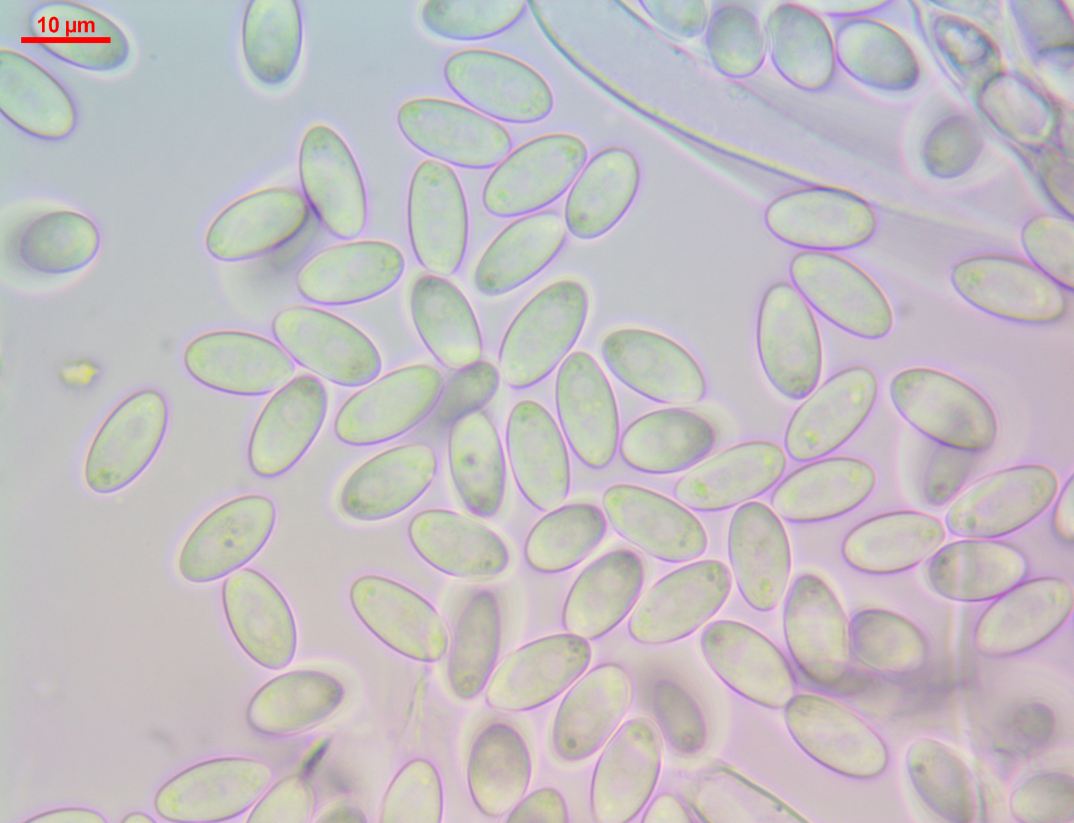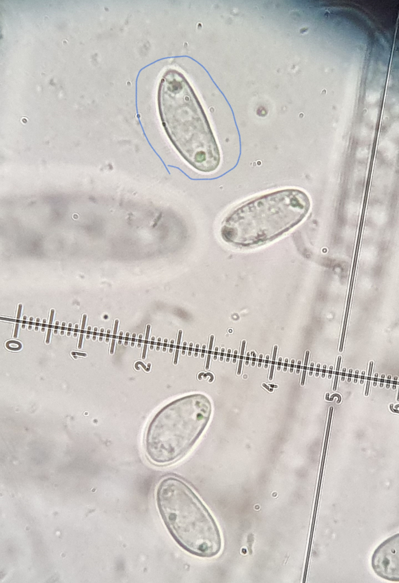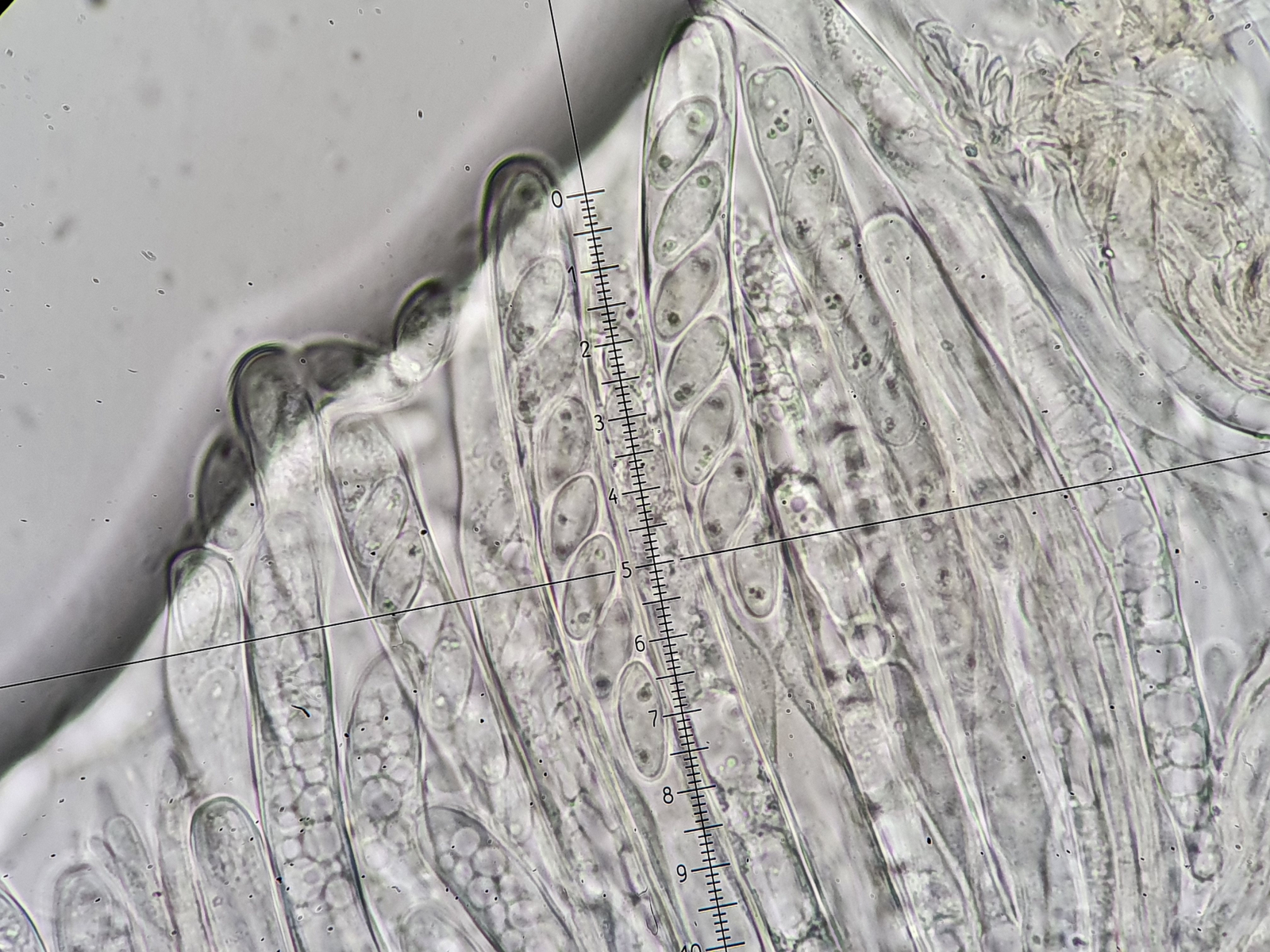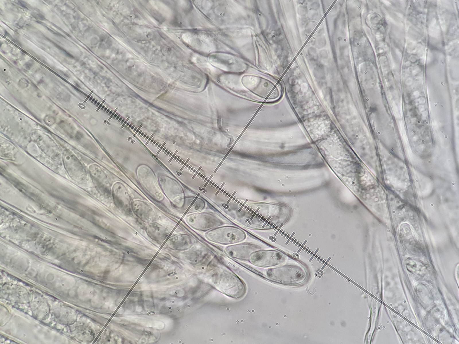 Die Asci sind wie auf den Bildern zu sehen 8-sporig. Auffallend sind die Tröpfchen an den Polen der Sporen. Dieses Merkmal habe ich in den Beschreibungen des Scharbockskrautbecherling gefunden. Sporen etwa 14x7 µm. Das würde auch passen.