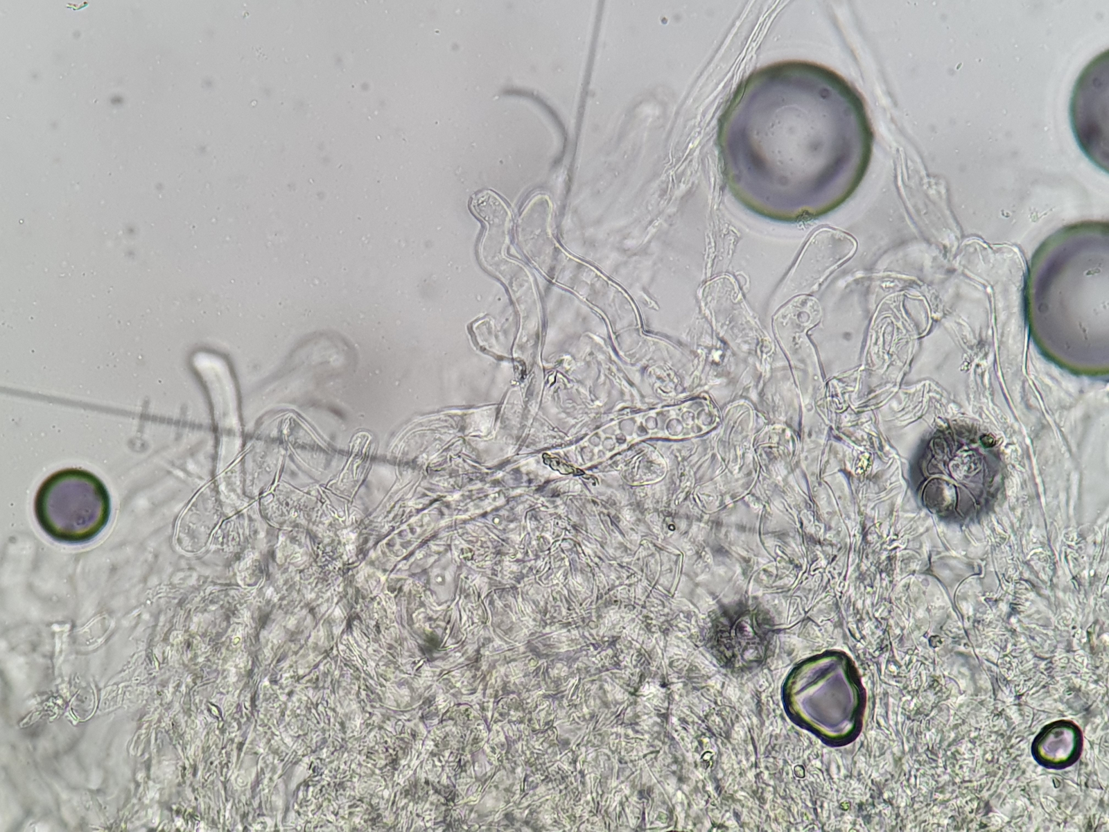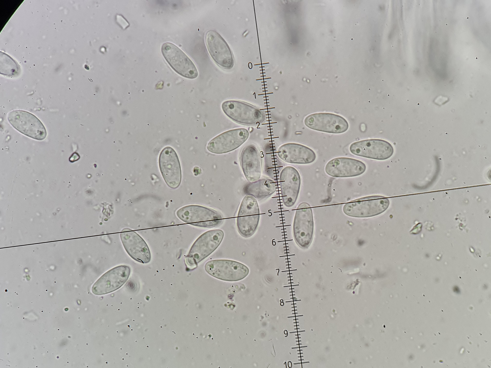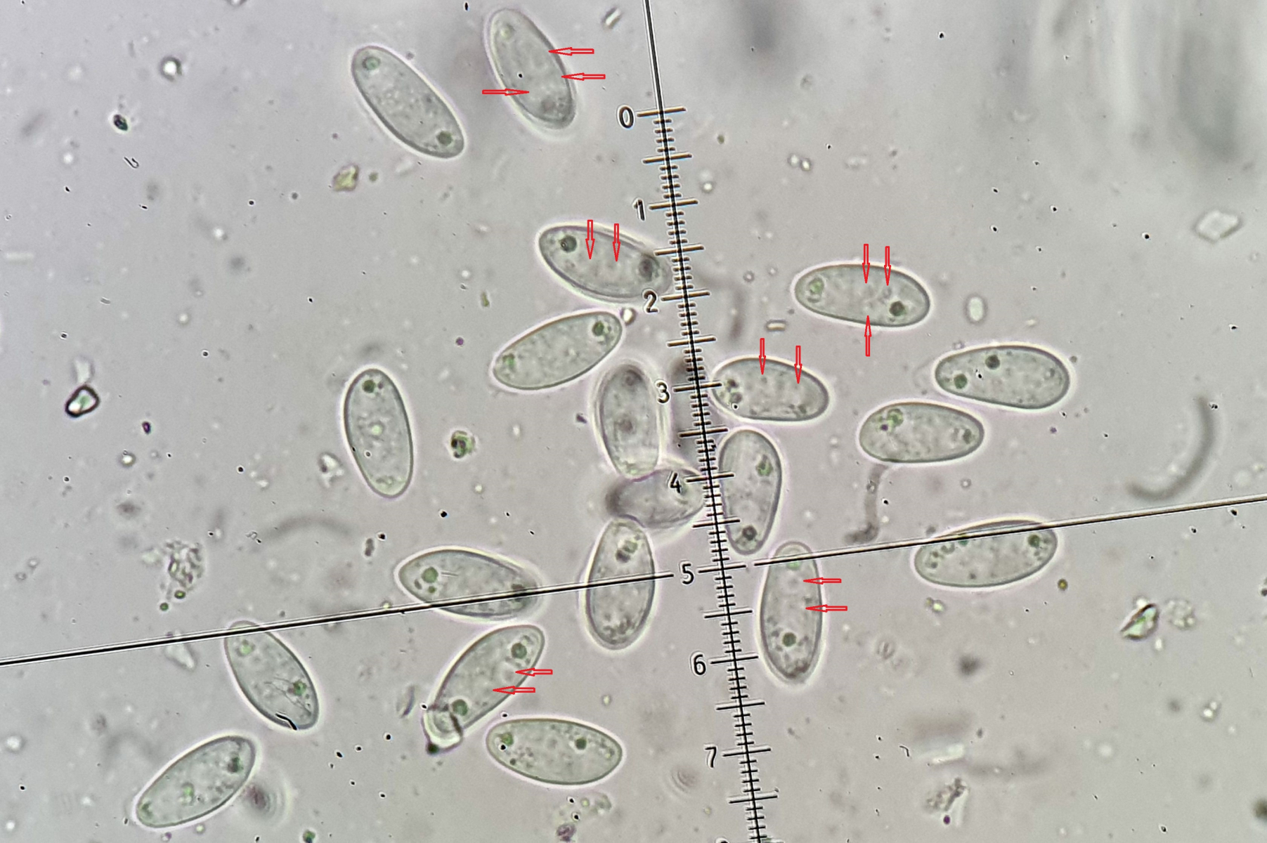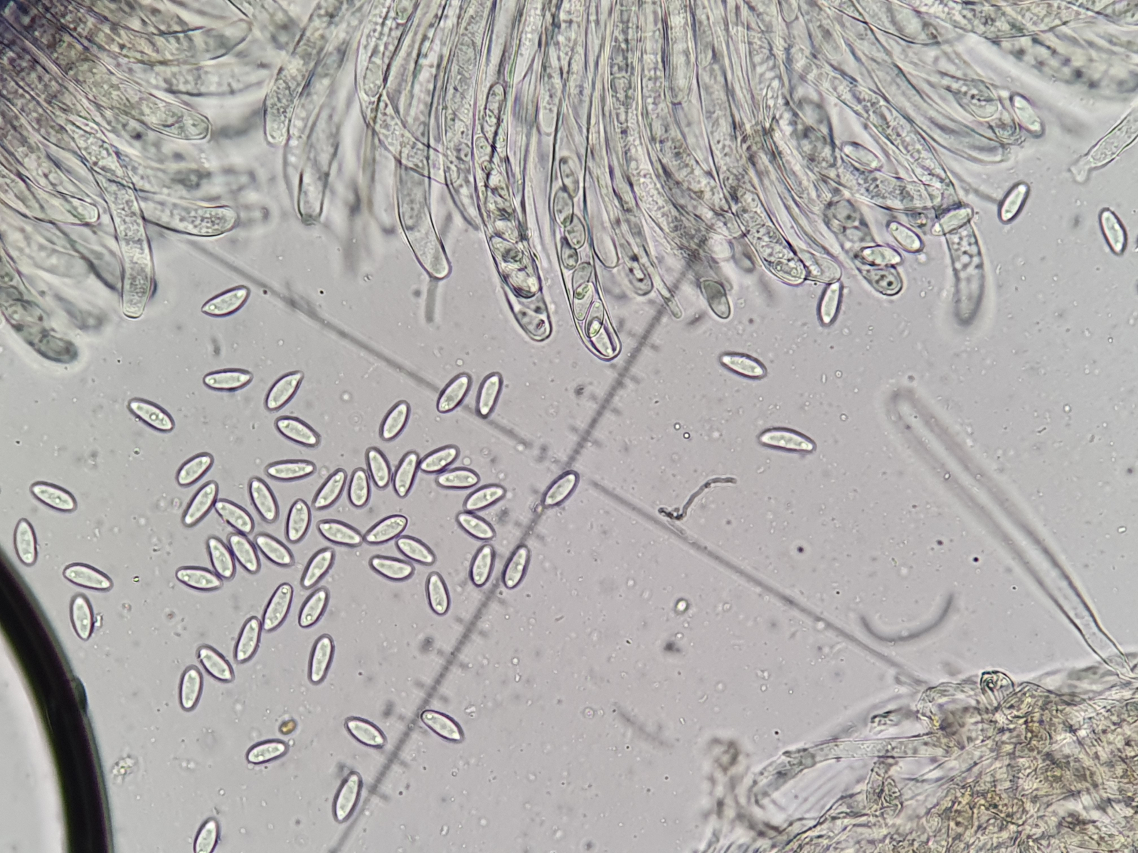Die Asci sind wie auf den Bildern zu sehen 8-sporig. Auffallend sind die Tröpfchen an den Polen der Sporen. Dieses Merkmal habe ich in den Beschreibungen des Scharbockskrautbecherling gefunden. Sporen etwa 14x7 µm. Das würde auch passen.