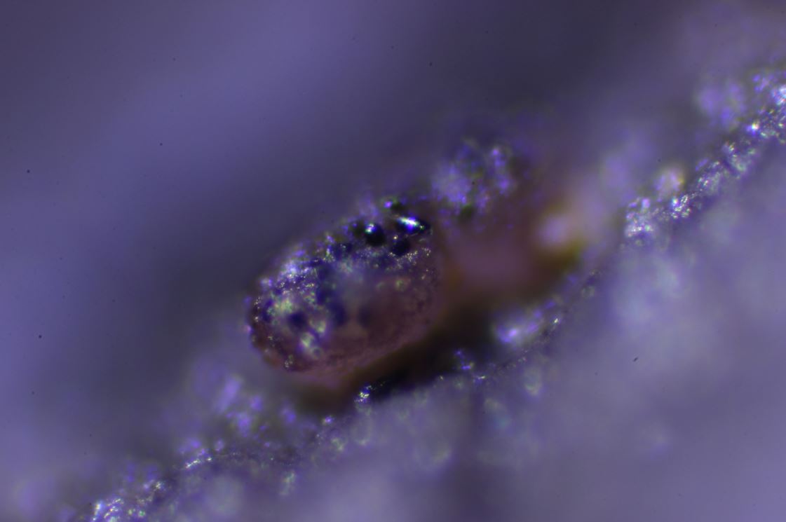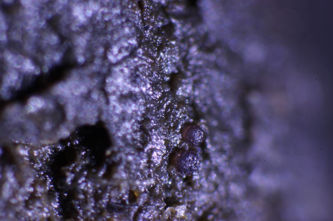 -Exemplare bis 0.2 mm im Durchmesser, bei Reife fast zweifarbig erscheinend, mit weinrotfarbenem Excipulum, auf Hirschlosung gleich mit der Schneeschmelze.