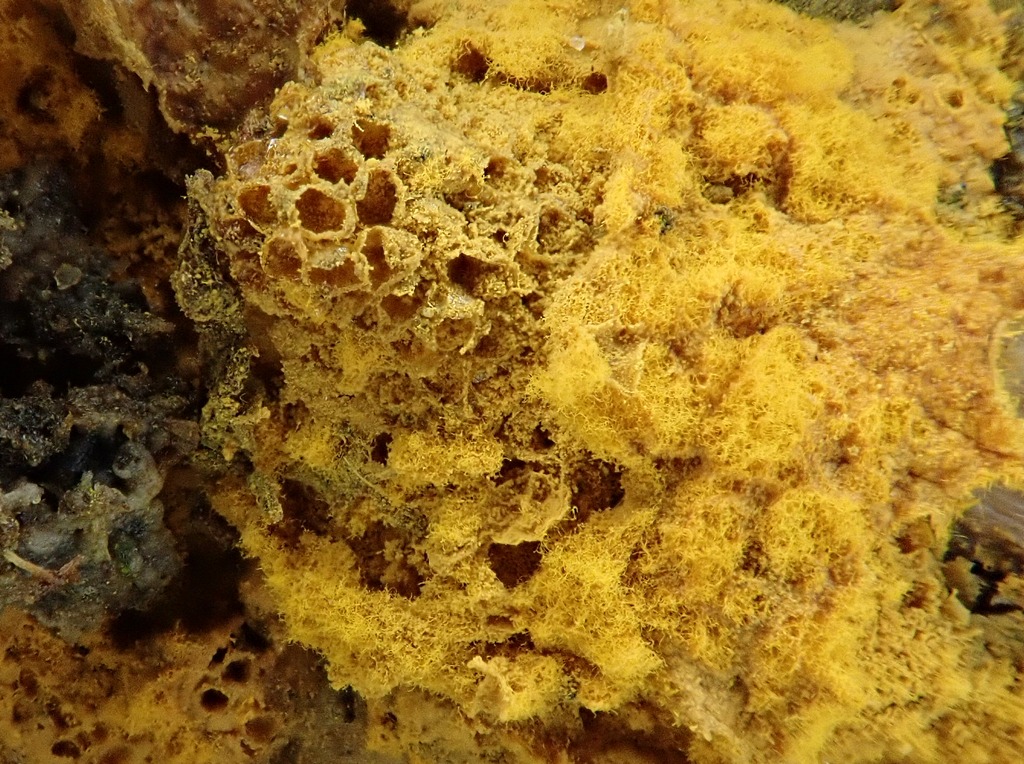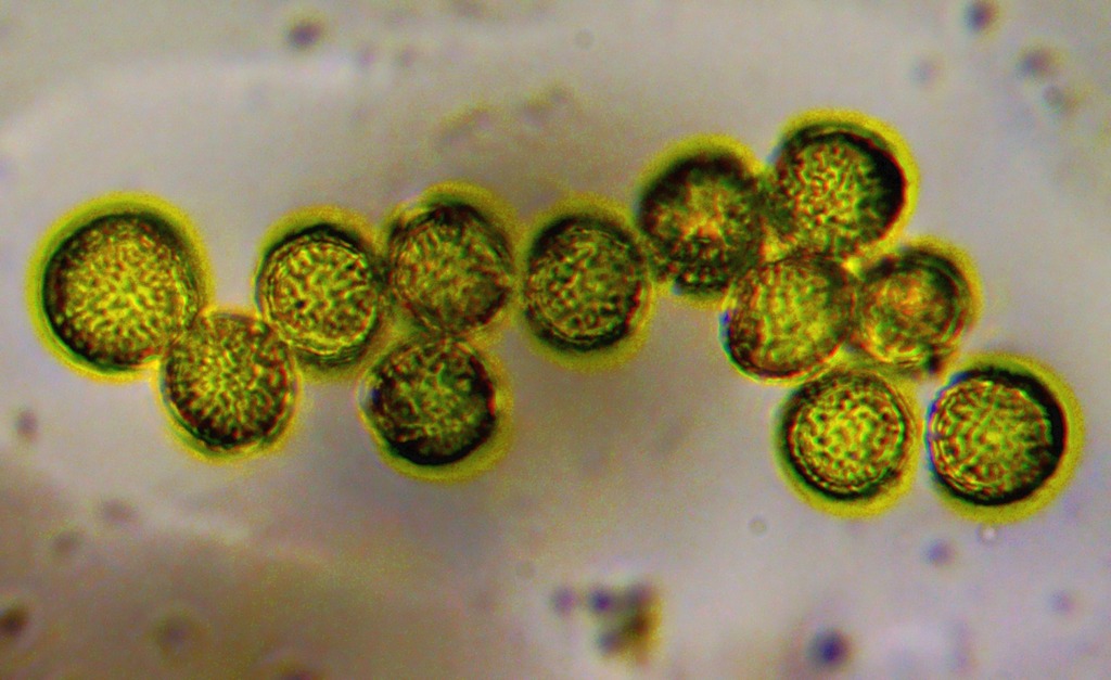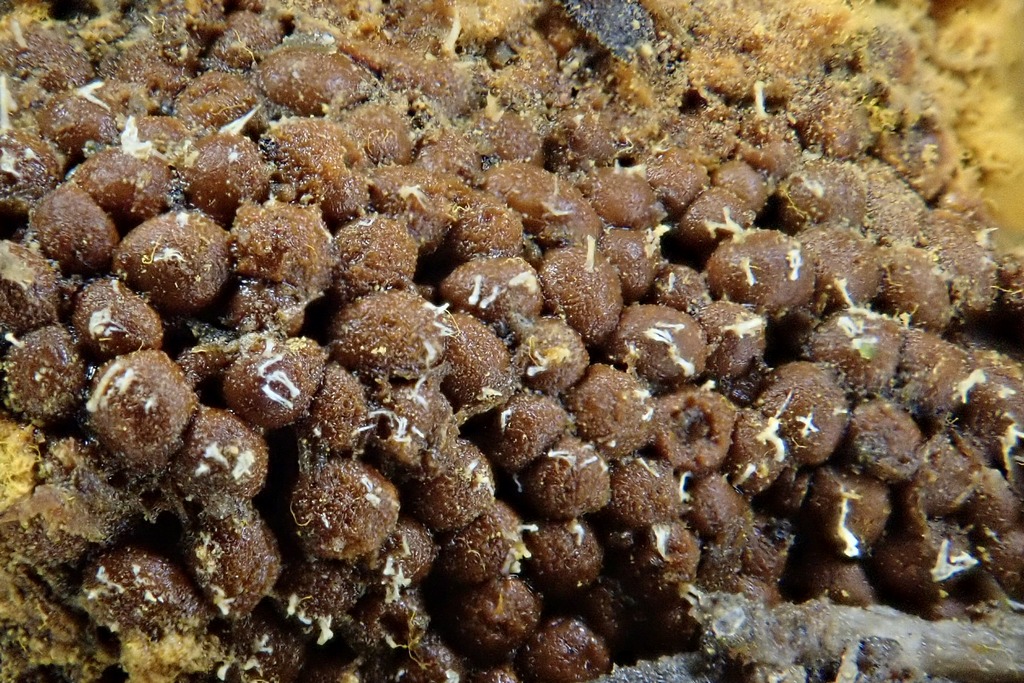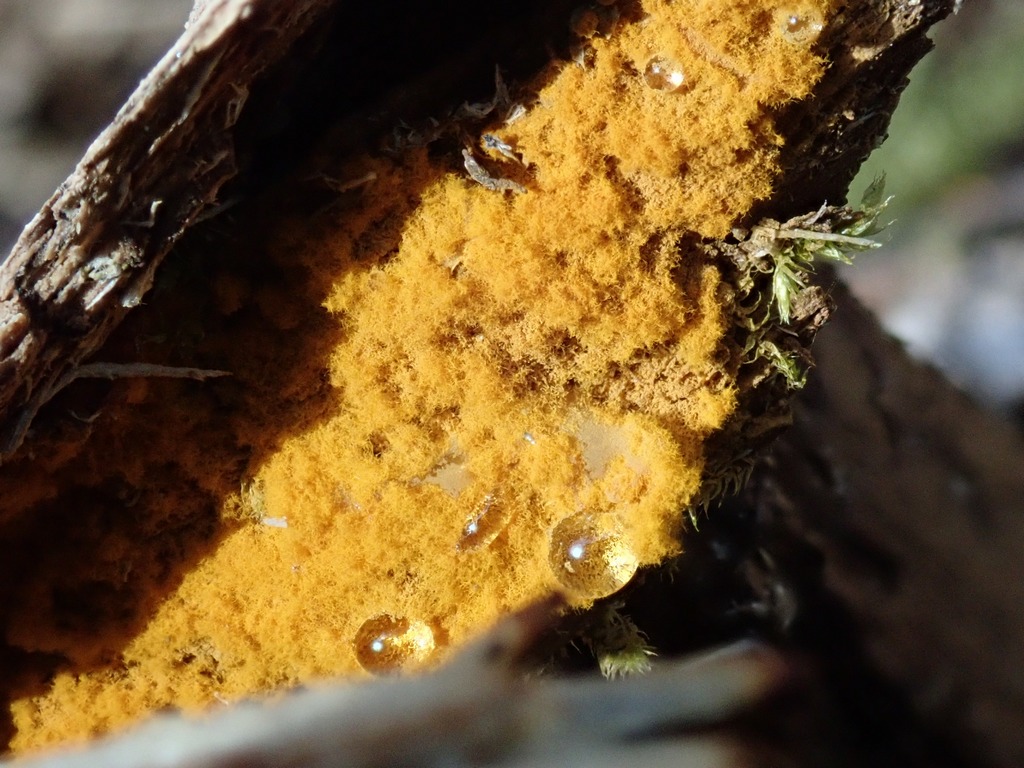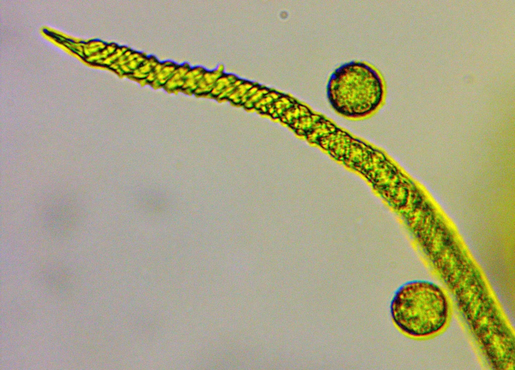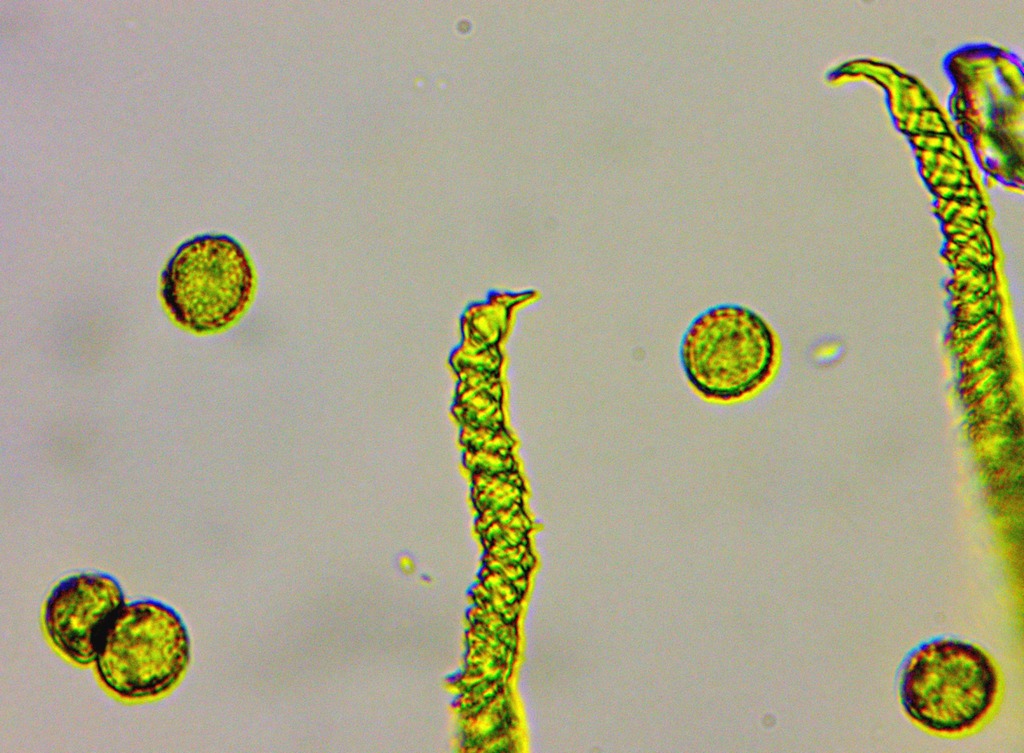 Der gedrängte Wuchs, die orange Farbe, die Sporengröße von 9-11 µ und die allesamt nur einfach zugespitzten Capillitiumenden führen mich zu Trichia scabra.