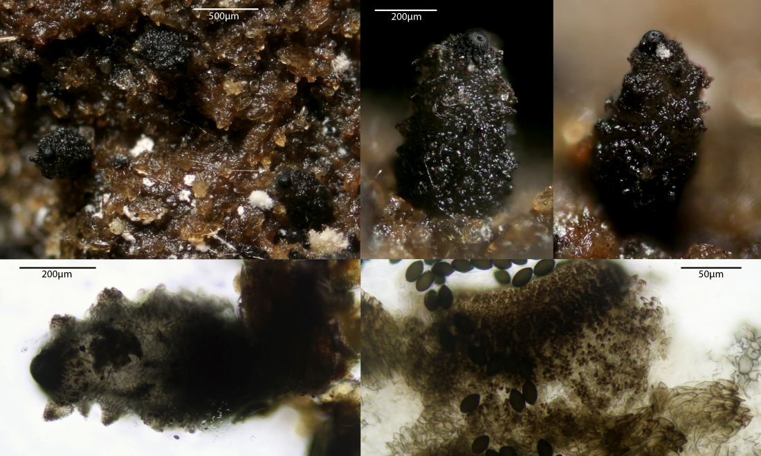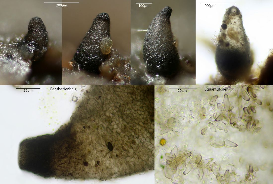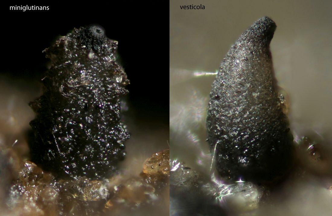 Makroskopisch kann man schon Unterschiede sehen, denn vesticola hat nur sehr kleine Squamufolien, was die Perithezien halbwegs glatt aussehen lässt. S. miniglutinans hat viel deutlichere Squamufolien, was den Fruchtkörpern ein schuppiges Aussehen verleiht. Das Foto ist von den folgenden das einzige nicht maßstabsgetreue, das Exemplar von vesticola war nur etwa 2/3 so hoch wie das von miniglutinans: