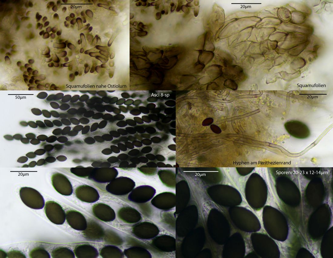 Bei miniglutinans finden sich außerdem gerne hyphoide Haare an der Außenseite der Perithezien, die sind unten im Thread in den kompletten Darstellungen zu sehen.