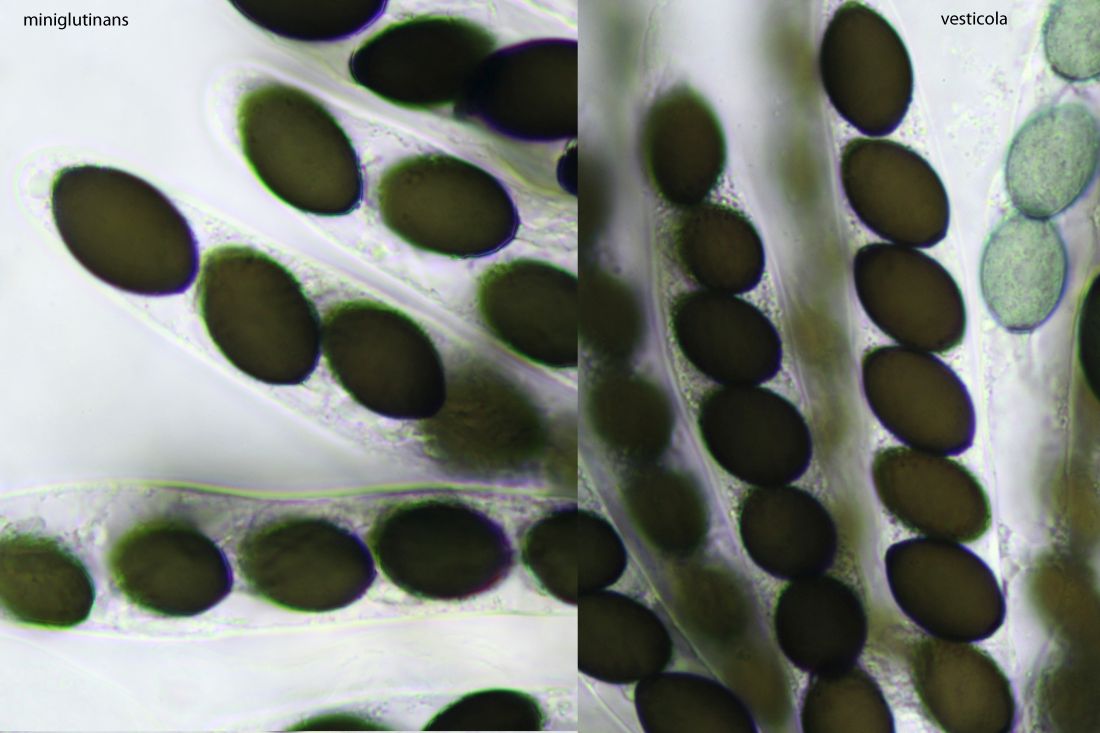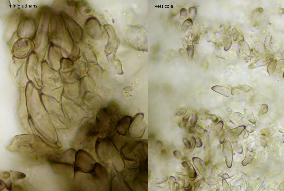 Ein wesentlicher Unterschied ist die Sporenbreite. Auch wenn die Länge hier bei diesen typischen Exemplaren nicht überlappt, kann das durchaus vorkommen. Die Breite ist aber verschieden, bei vesticola i.d.R. bis 11µm, kaum mal 12µm. Bei miniglutinans geht es normalerweise bei 12 los und erreicht regelmäßig 14µm, oft auch noch daüber, wobei sich das Exemplar hier mit unter 15µm zufrieden gab.
