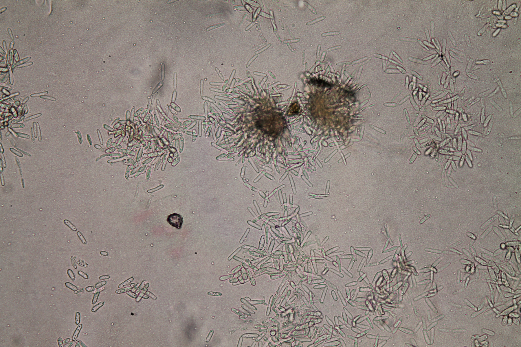 Ich habe nur ein Mikrofoto von den Brandsporen in den Blattzellen.