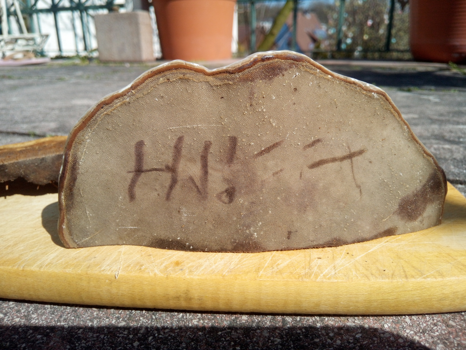 Der Hut reagiert nicht auf Hitze, kleine, runde Poren, ich schwanke zwischen flachem Lackporling oder Zunderschwamm der evtl. kaum Sonne abbekam.