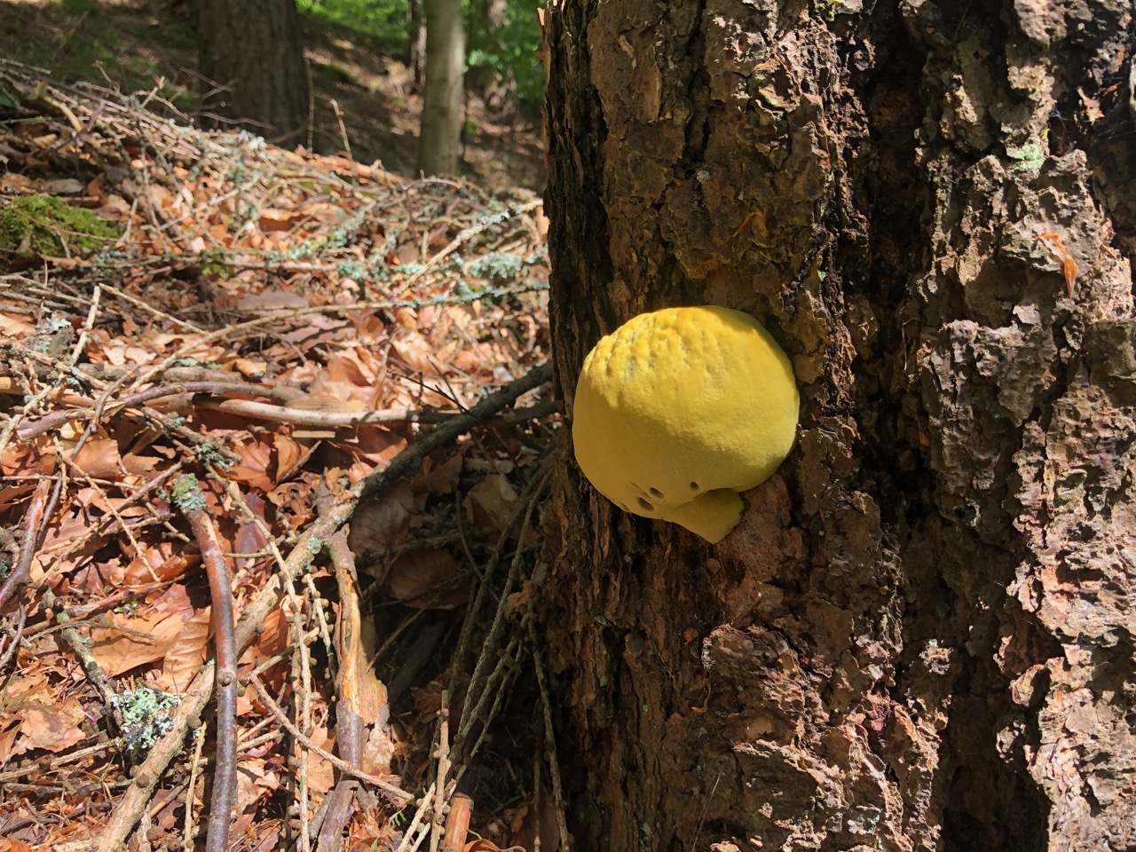Übrigens, gerade habe ich den ersten Nadelholzbraunporling des Jahres - passend zu Habichts Rätsel gefunden. Fett, rund und gelb: