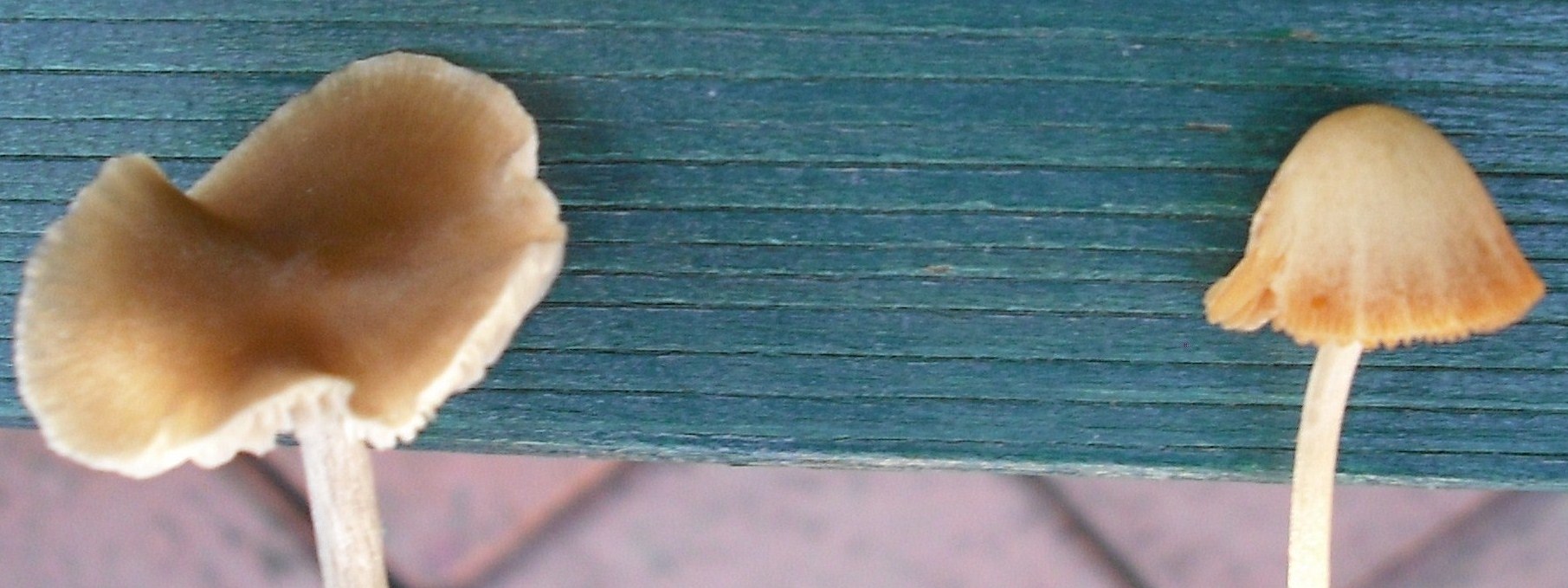 Der rechte FK hat kräftige, rostfarbene Lamellen, was bei Mycena-Arten so nicht vorkommt. Zwar können die Lamellen mal gefärbt sein, aber nicht so kräftig.