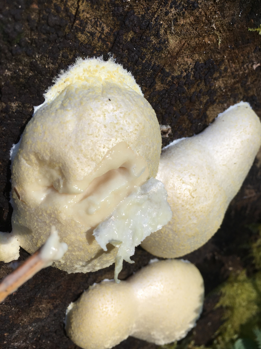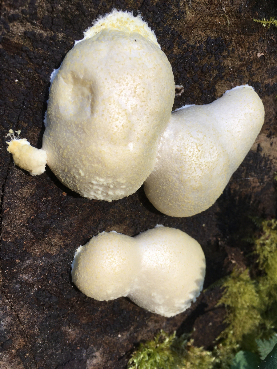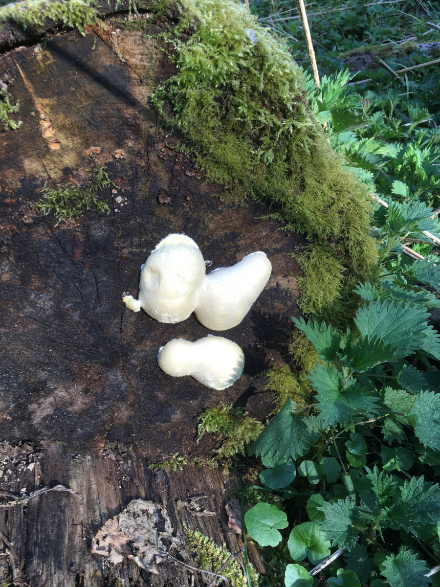 als ich heute durch den, leider knochentrockenen, Auwald striff (natürlich nur rein zufällig:giggle:) fand ich zwar keine bodengebundenen Schwammerl aber immerhin an einem großen Erlenstumpf mehrere gelbe Ostereier! Größe ca 6cm und ca 2-3cm abstehend. Grund weisslich bis schwach gelblich, darüber mit feinen gelben Körnchen bedeckt, so dass aus der Distanz ein deutl. gelber Eindruck entsteht. Die Beschwaffenheit war interessant. Am besten beschreibt sie wohl Creme brulee... außen eine resche Kruste, innen steife gelbe Sahne. Den Geschmack habe ich nicht geprüft, obwohl es mich gereizt hätte- aber vermutlich war das besser so<X. Soweit das Deskriptive. Was habe ich da gefunden? Leider fehlt mir jegliche Schleimpilz Literatur und natürlich rechne ich auch nicht mit einer makroskopischen Bestimmung. Aber vielleicht hat ja jemand ein paar Anregungen?