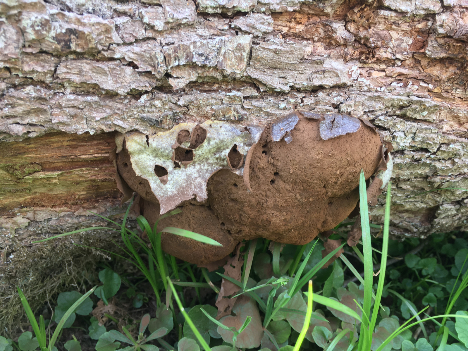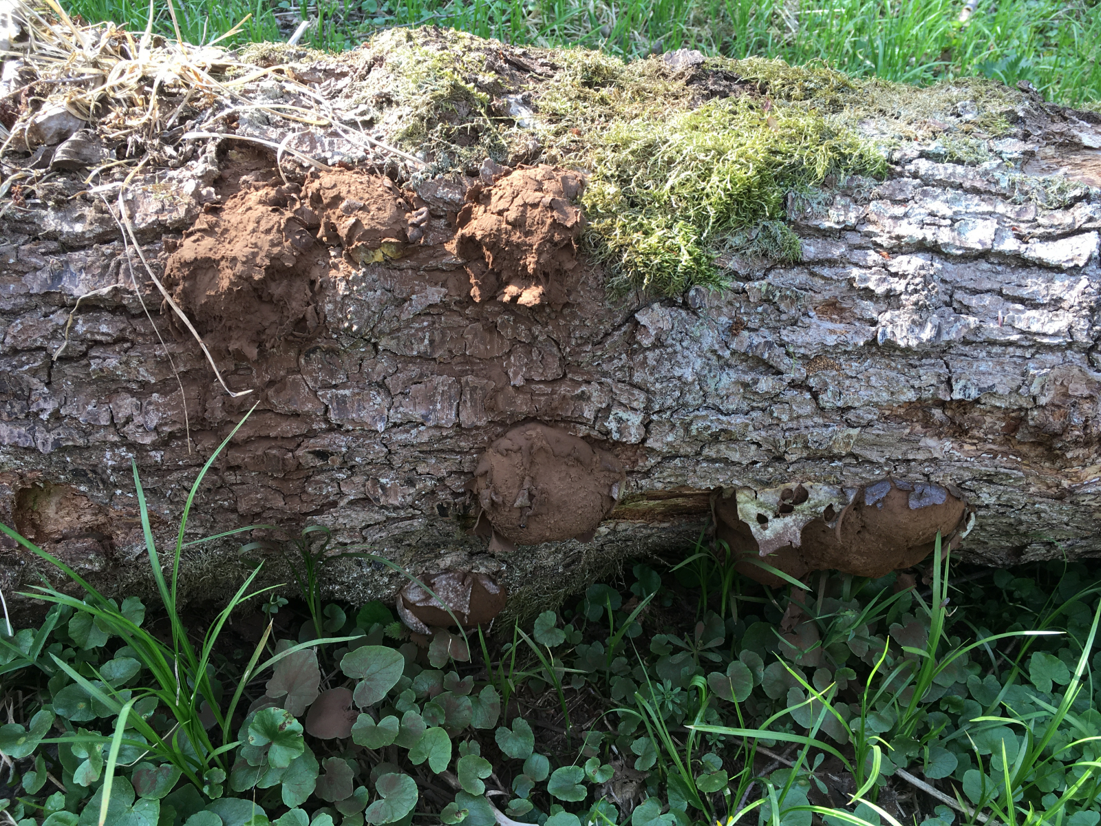 d) verschiedene FK an einem Stamm, Sporenpulver freigesetzt (b rechts unten)