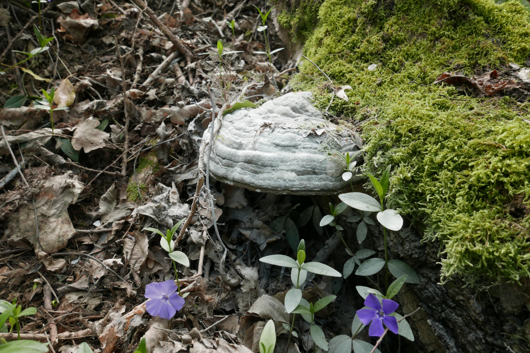 04. Im Hintergrund ein Vinca minor-Teppich. Man sieht, dass das hier mal ein Garten war. Im Vordergrund haben die Wildschweine irgendetwas unter dem toten Baum gesucht.