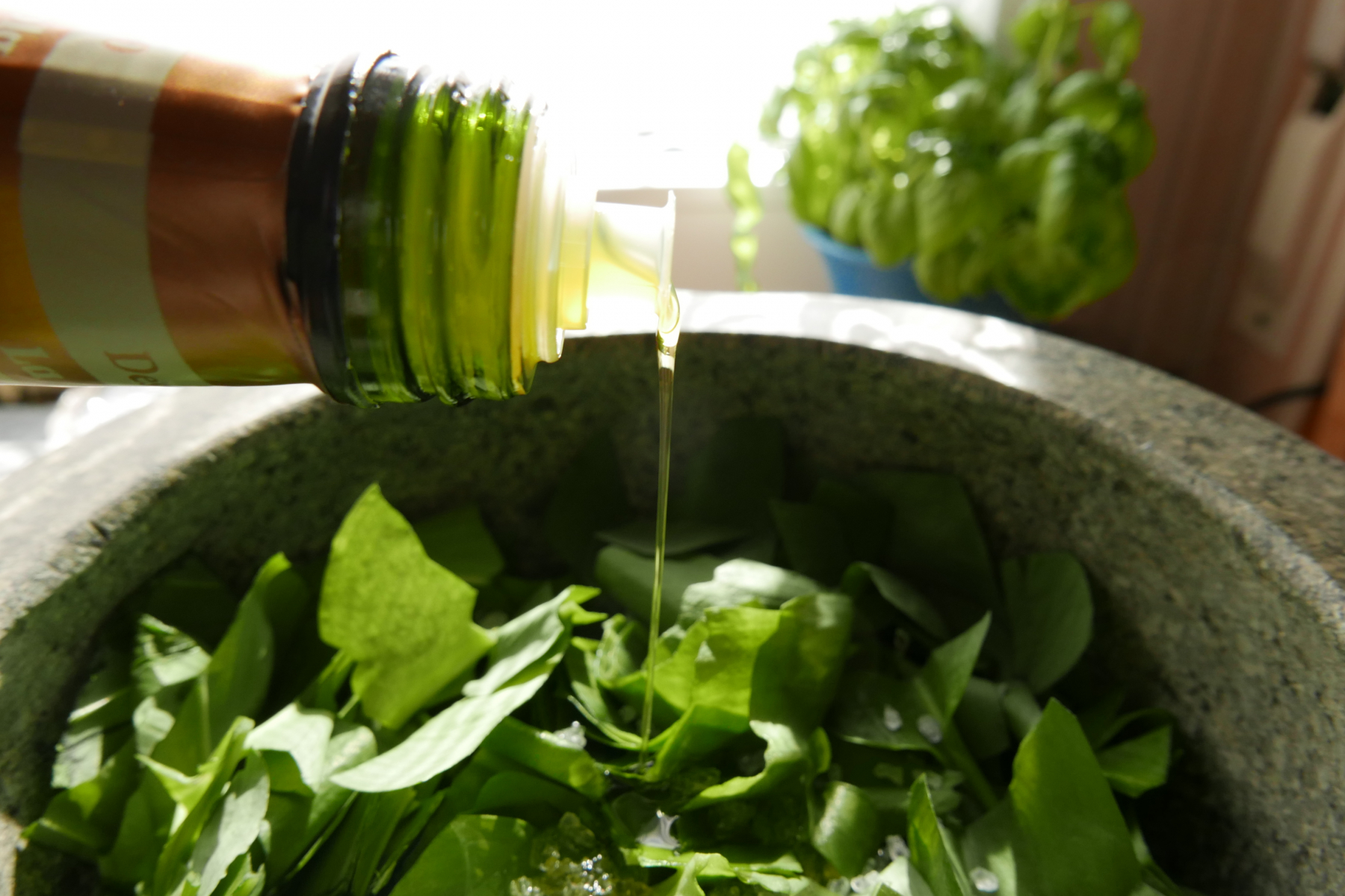 So, das lecker Kräutchen heimgebracht und ein Bärlauchpesto zum Einlagern in den Kühlschrank zubereiten: