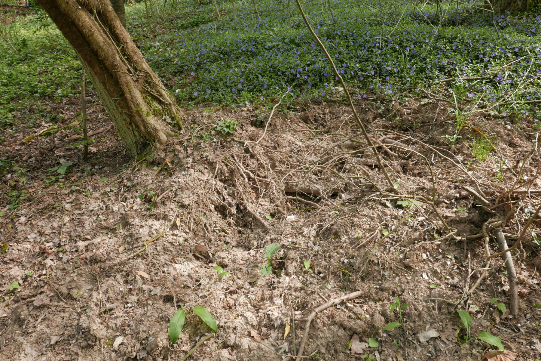 04. Im Hintergrund ein Vinca minor-Teppich. Man sieht, dass das hier mal ein Garten war. Im Vordergrund haben die Wildschweine irgendetwas unter dem toten Baum gesucht.