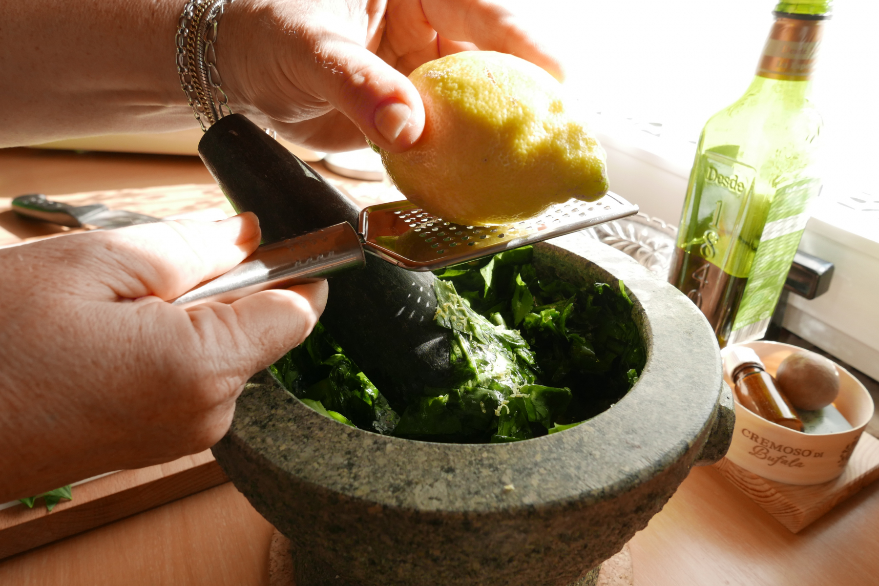 16. Zitronenschale und etwas Saft sowie grobes Salz. Gut mit dem Mörser durcharbeiten. Das braucht etwas Geduld