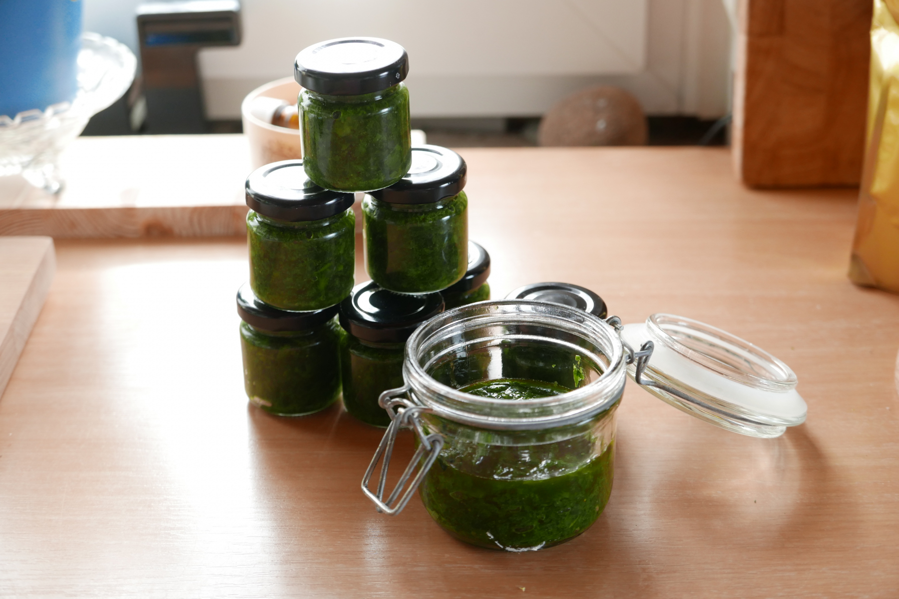 So, das lecker Kräutchen heimgebracht und ein Bärlauchpesto zum Einlagern in den Kühlschrank zubereiten: