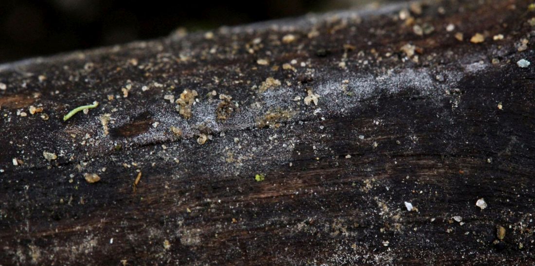 Hier eine sehr kleine, relativ leicht kenntliche Art, Candelabrum spinulosum. Suchen kann man sowas an Rändern von Bächen oder stehenden Gewässern auf frisch angetrockneten Substraten, denn die Pilze bilden sobald sie eine Zeit lang vom Wasser freiliegen ihre Konidien. Man sieht dann maksorkopisch nichtssagende weißliche Beläge, oft sehr klein, manchmal aber auch mehrere Zentimeter groß wie hier. Und das, obwohl die einzelnen Konidien, und aus nahezu nichts anderem besteht der Pilz, nur 14-17µm im Durchmesser haben und damit einer der kleinsten Aero-Aquaten ist.