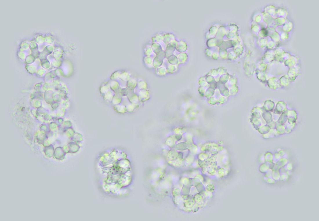 Charakteristische Konidien, grob 14-17µm Durchmesser, oben mit fein rauer Oberfläche, damit hält sich die Luft im Inneren besser. Für das Präparieren empfiehlt es sich, z.B. etwas Seife ins präparat zu geben, dann bekommt man störende Lufteinschlüsse recht gut raus und sieht die Struktur der Konidien besser.