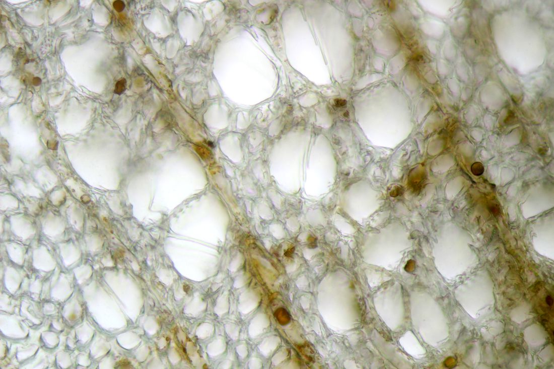 Hier eine sehr kleine, relativ leicht kenntliche Art, Candelabrum spinulosum. Suchen kann man sowas an Rändern von Bächen oder stehenden Gewässern auf frisch angetrockneten Substraten, denn die Pilze bilden sobald sie eine Zeit lang vom Wasser freiliegen ihre Konidien. Man sieht dann maksorkopisch nichtssagende weißliche Beläge, oft sehr klein, manchmal aber auch mehrere Zentimeter groß wie hier. Und das, obwohl die einzelnen Konidien, und aus nahezu nichts anderem besteht der Pilz, nur 14-17µm im Durchmesser haben und damit einer der kleinsten Aero-Aquaten ist.