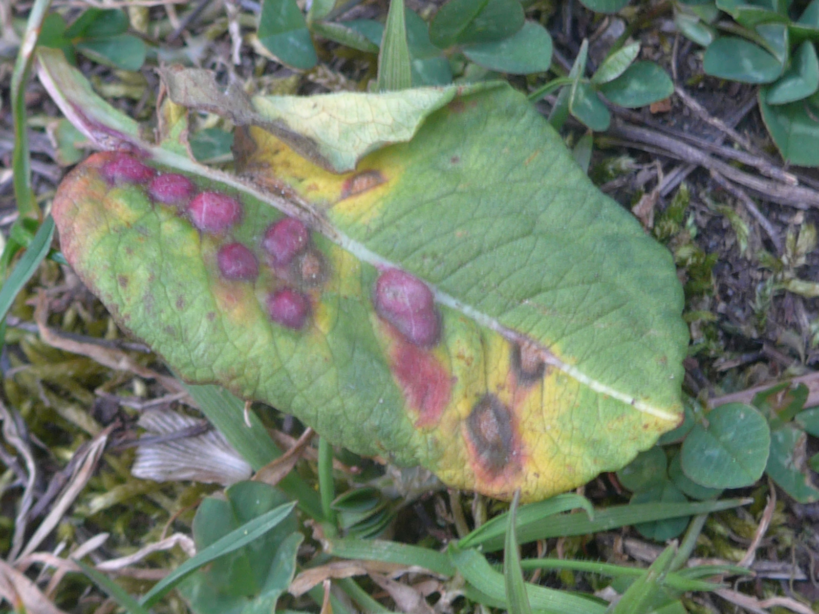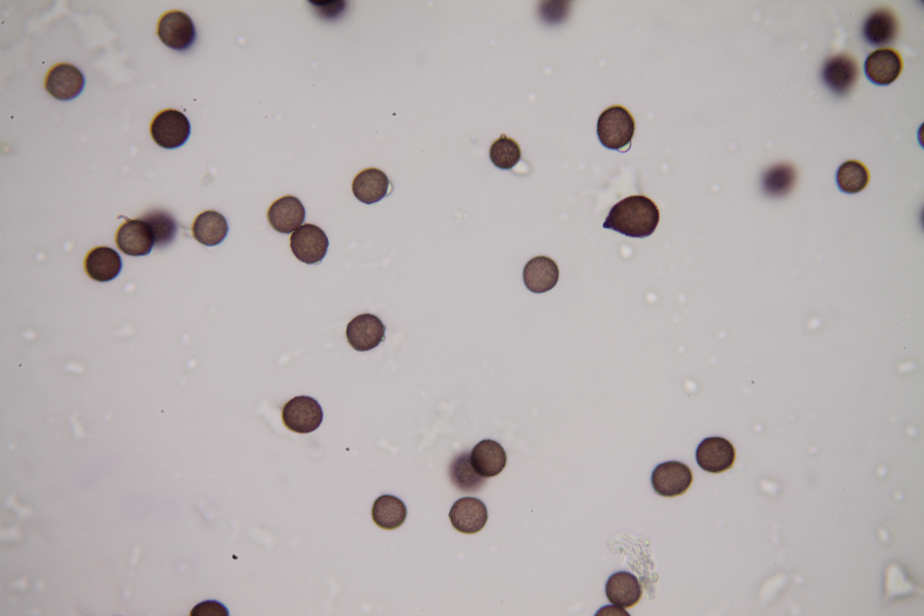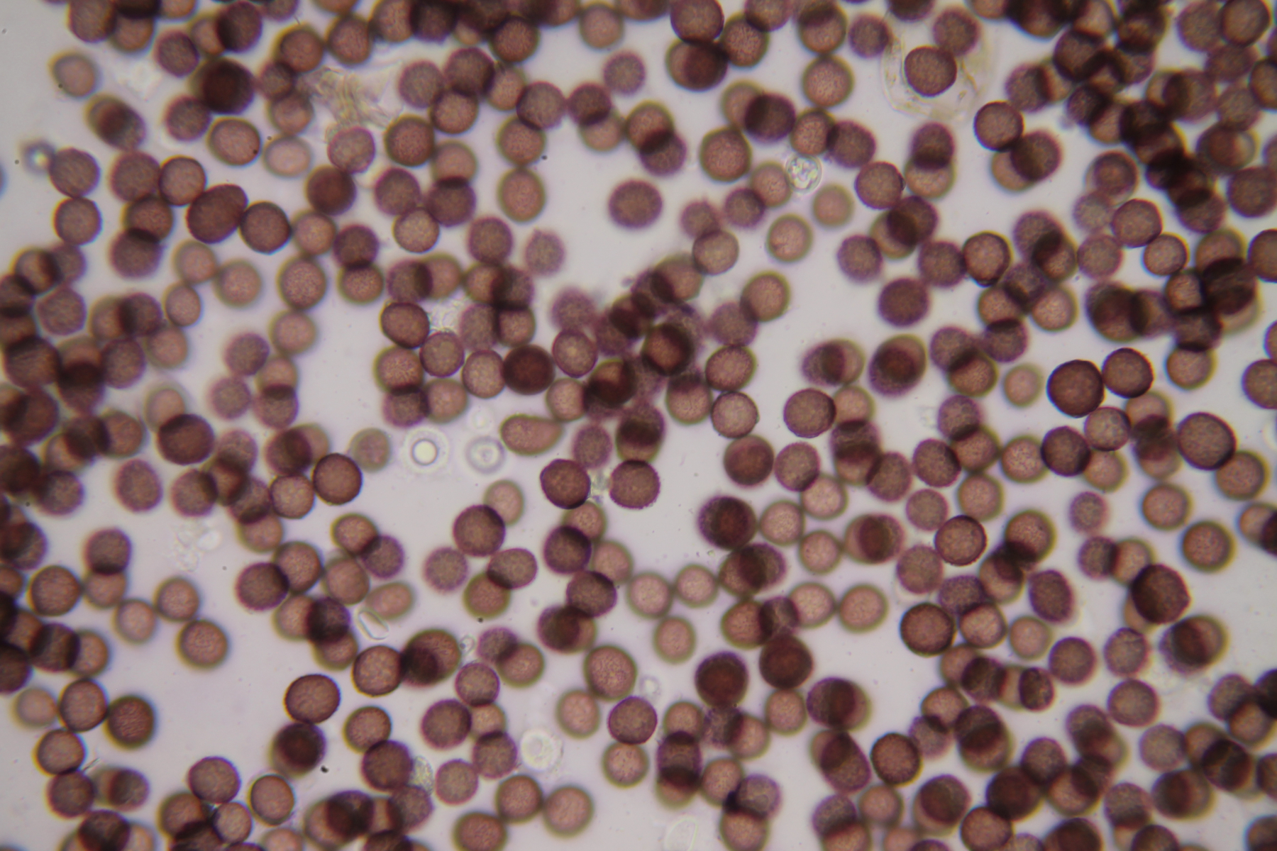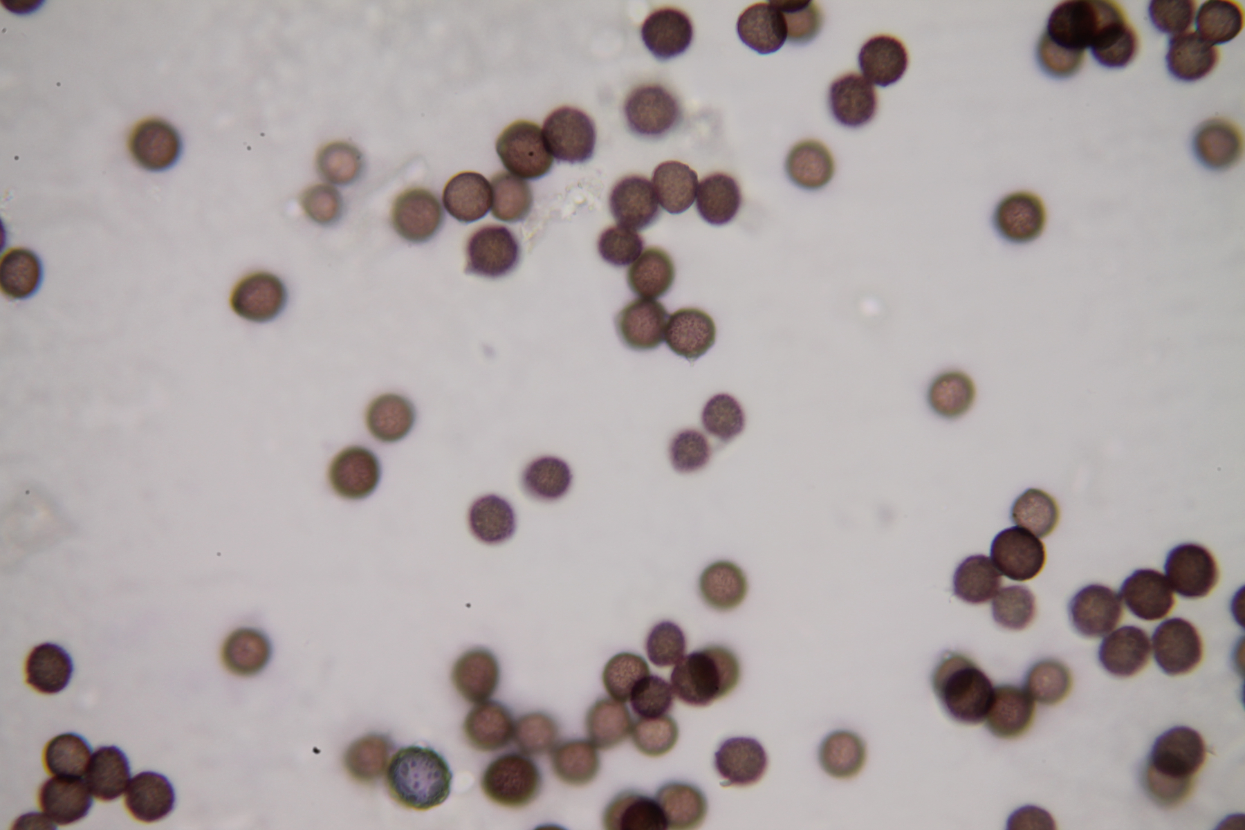 Nun kommt ein Brandpilz, den ich am 8.4.2020 auf einer Exkursion im Schlosspark Hermsdorf am Ufer der Großen Röder gefunden habe. Mir fielen auf einer Wiese in Bachnähe diese interessant gestalteten Blätter auf. Einige davon wiesen auch violette Verdickungen auf. Unbekannte Pflanzen einfach anhand der ersten Blätter, ohne Blüte, zu bestimmen ist oft nicht möglich, weswegen ich einige Botanikerfreunde auf FB um Rat fragte. Die Pflanze wurde schnell als Bistorta offcinalis, bzw. alter Name Polygonum bistorta - Schlangenknöterich bestimmt. Bei der Überprüfung der Verdickungen stellte ich fest, dass es sich um Brandbutten handelt. Mit dem Klenke/Scholler stieß ich dann auf den Pilz Microbotryum pustulatum, welcher meist laut der roten Bibel nur die ersten Blätter des Knöterichs besiedelt/befällt. Sporen sind fein punktiert, rund; 11-17 µm Durchmesser.