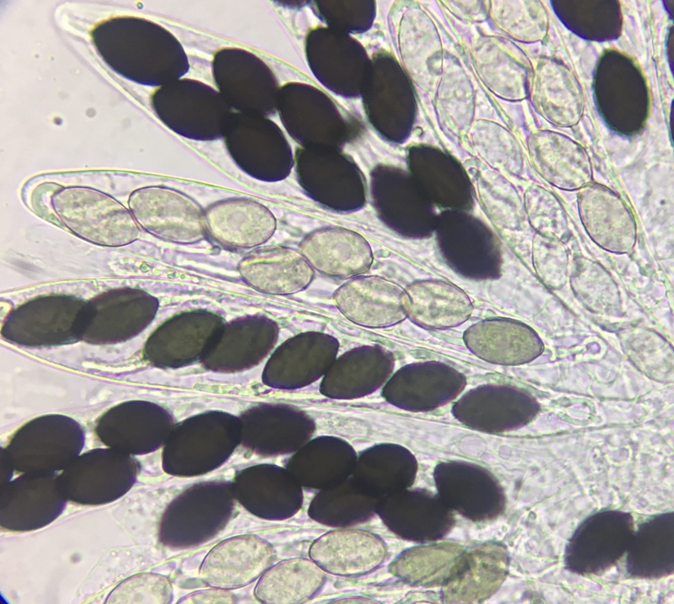 Ich schaue mir hier eine Podospora an und komme nicht weiter. Leider ist sie achtsporig und 22-24µm x 14-15µm, was ja öfter vorkommt. Das Pedicel ist sehr lang, über 80µm oder so. Das ganze wächst in Hirschlosung und das Perithecium (450-650) ist oft bis zum Hals versenkt. Ich dachte erst P. ellisiana, aber ich sehe keine Haare oder apikalen Ring. Für Schizothecium miniglutinans fehlen die Squamufolien. Kommt jemandem die Sache bekannt vor?