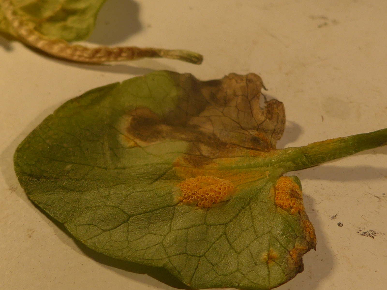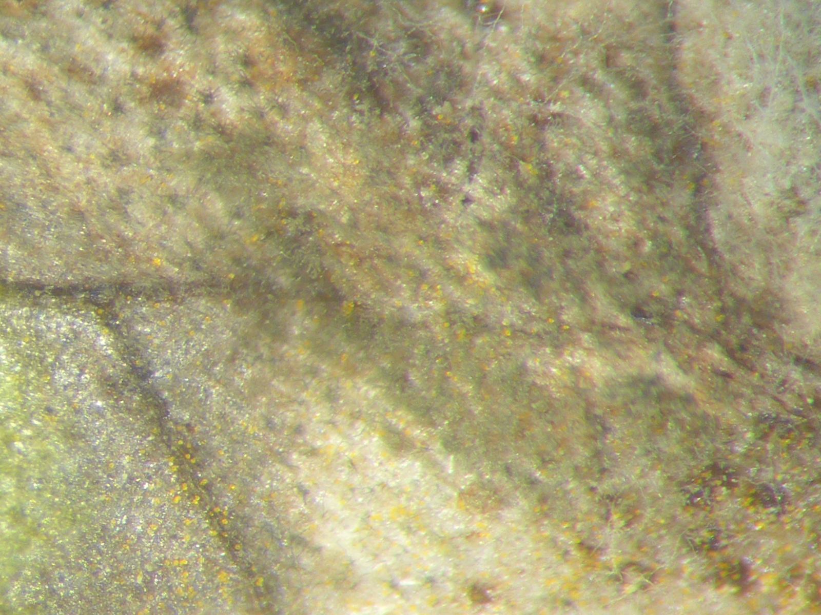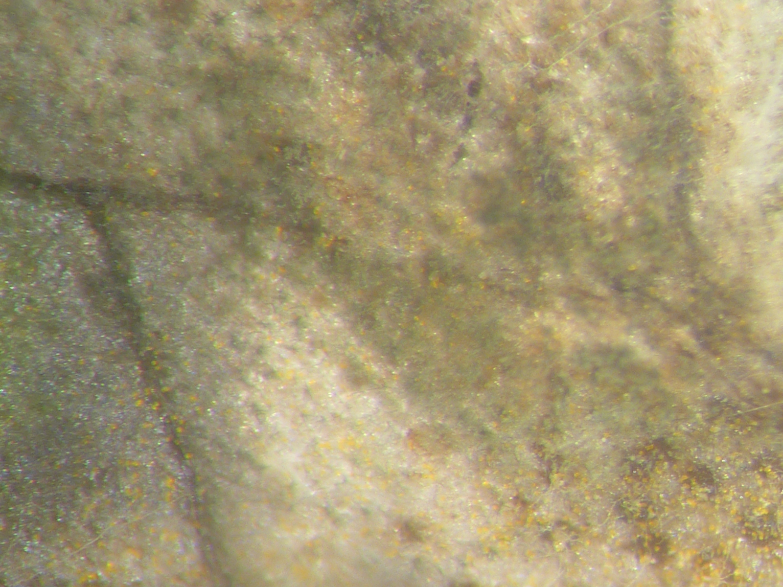 Nicht schlecht staunte ich, dass ich auch ein Blatt fand, was neben einem deutlichen Rostbefall auch so einen markanten braunen Blattfleck besaß. Auf der Blattunterseite fand ich in dem Blattfleck verkümmerte, bzw. abgestorbene Aecien. So ein Fund ist immer spannend, denn es Pilze, die parasitierende Pilze befallen, die sog. Hyperparasiten. Mir war sofort klar, dass ich hier so etwas gefunden haben musste. Bei diesen Hyperparasiten gibt es häufigere und auch seltener dokumentierte Arten und insgesamt deutlich mehr als man auf den ersten Blick so denkt.