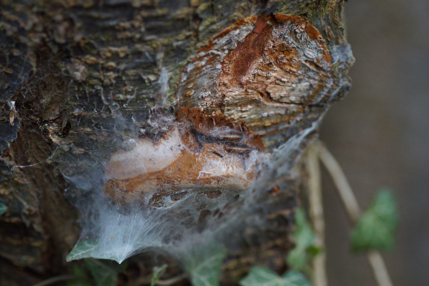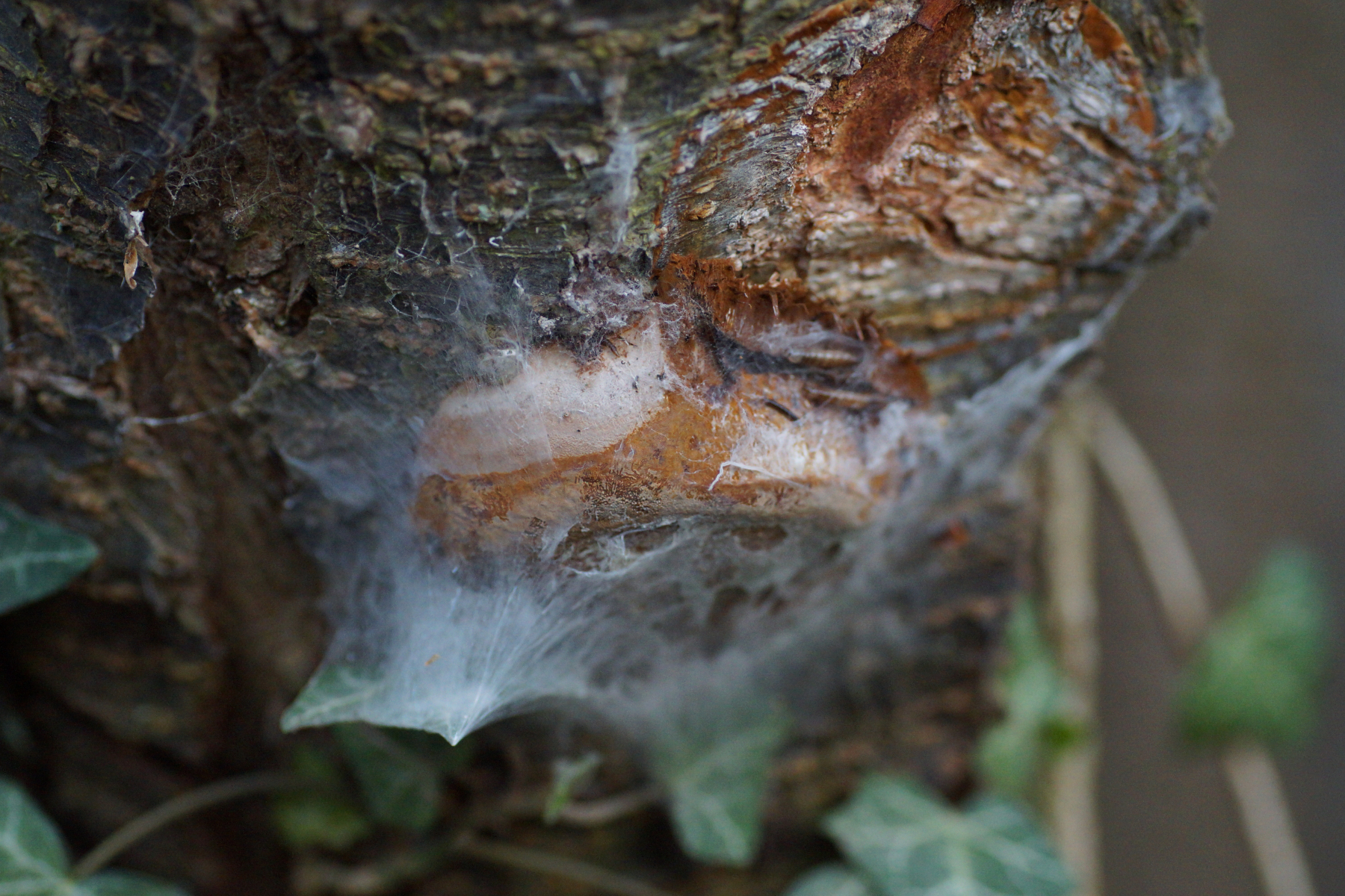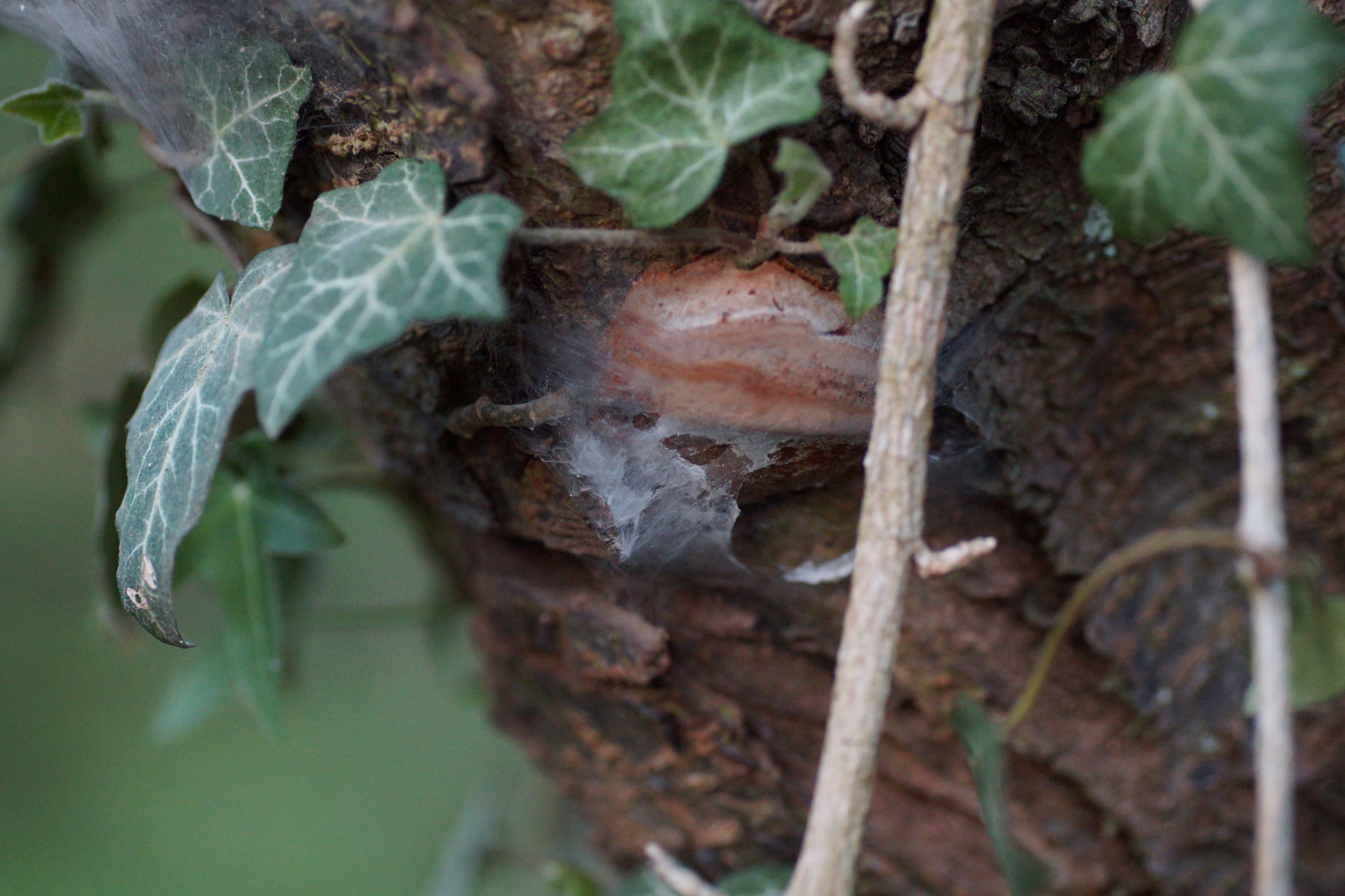 ich bin heute an einem Teich vorbeigekommen, an dem ein für mich nicht bestimmbarer, strauchartiger Baum stand. An diesem Baum sind mir gleich ein paar Stellen aufgefallen, an denen Gespinst klebte. Unter dem Gespinst fand ich, neben ziemlich kleinen Raupen, immer auch einen Pilz, vermutlich einen Porling. Überall sonst an diesem Baum waren keine Gespinste zu finden, nur an den Pilzen direkt.