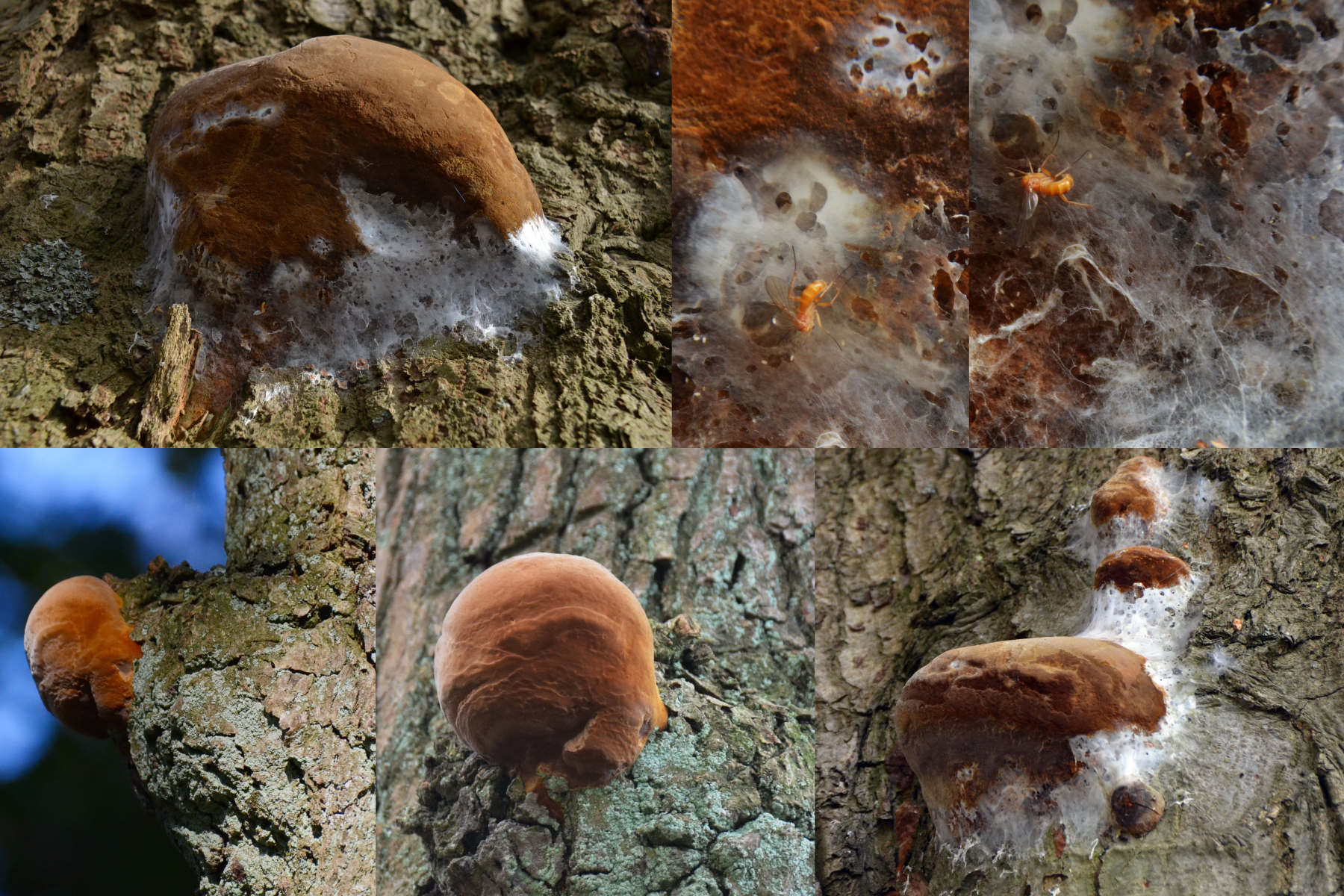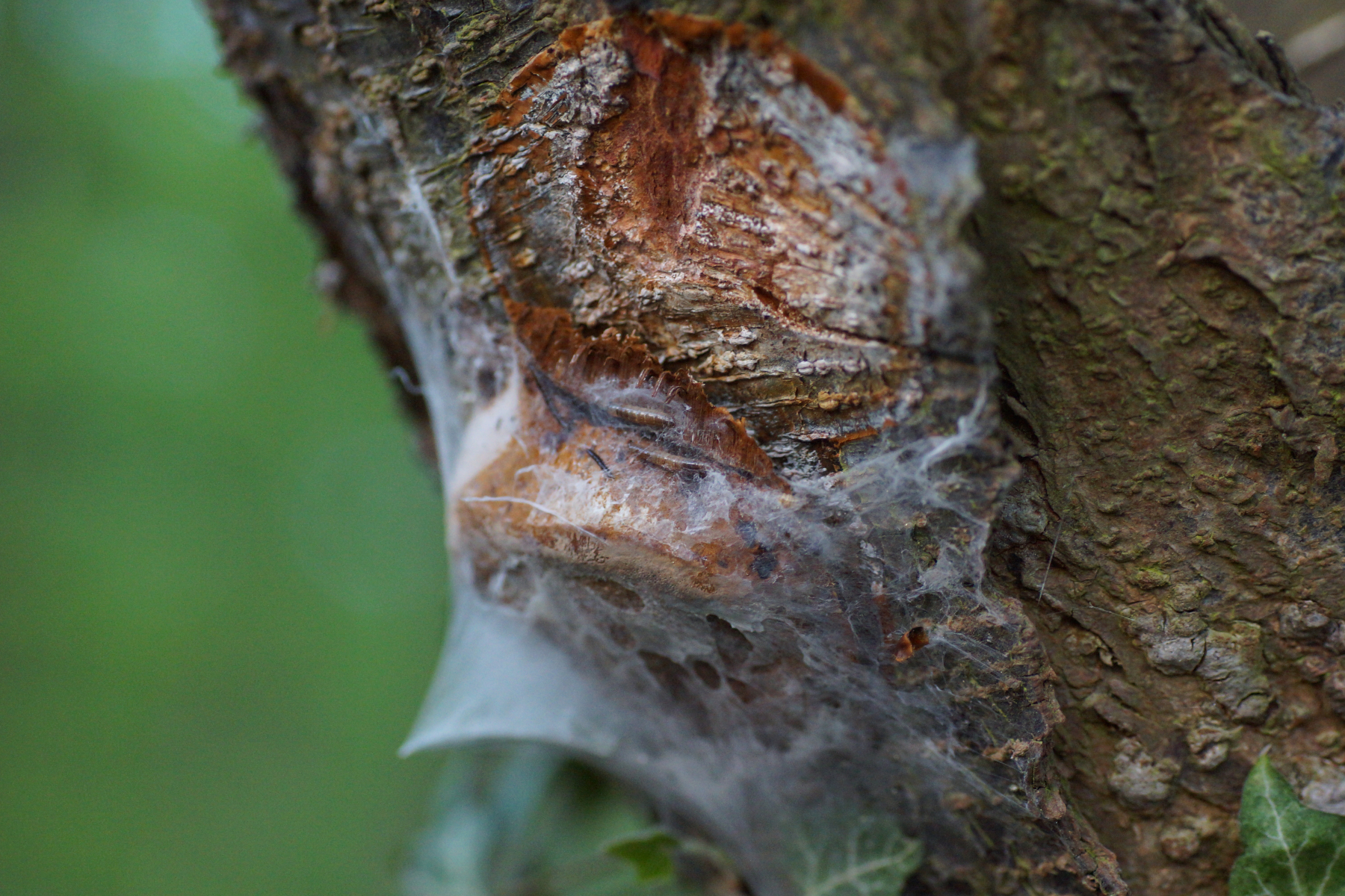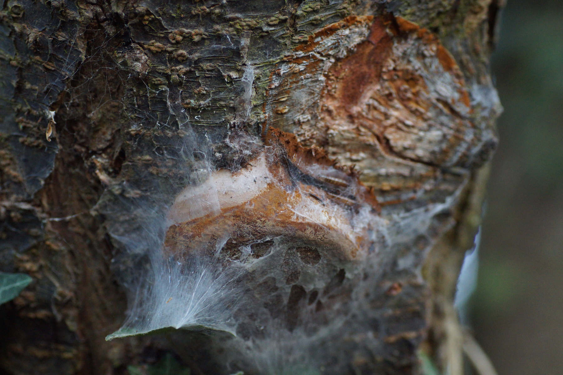 ich bin heute an einem Teich vorbeigekommen, an dem ein für mich nicht bestimmbarer, strauchartiger Baum stand. An diesem Baum sind mir gleich ein paar Stellen aufgefallen, an denen Gespinst klebte. Unter dem Gespinst fand ich, neben ziemlich kleinen Raupen, immer auch einen Pilz, vermutlich einen Porling. Überall sonst an diesem Baum waren keine Gespinste zu finden, nur an den Pilzen direkt.