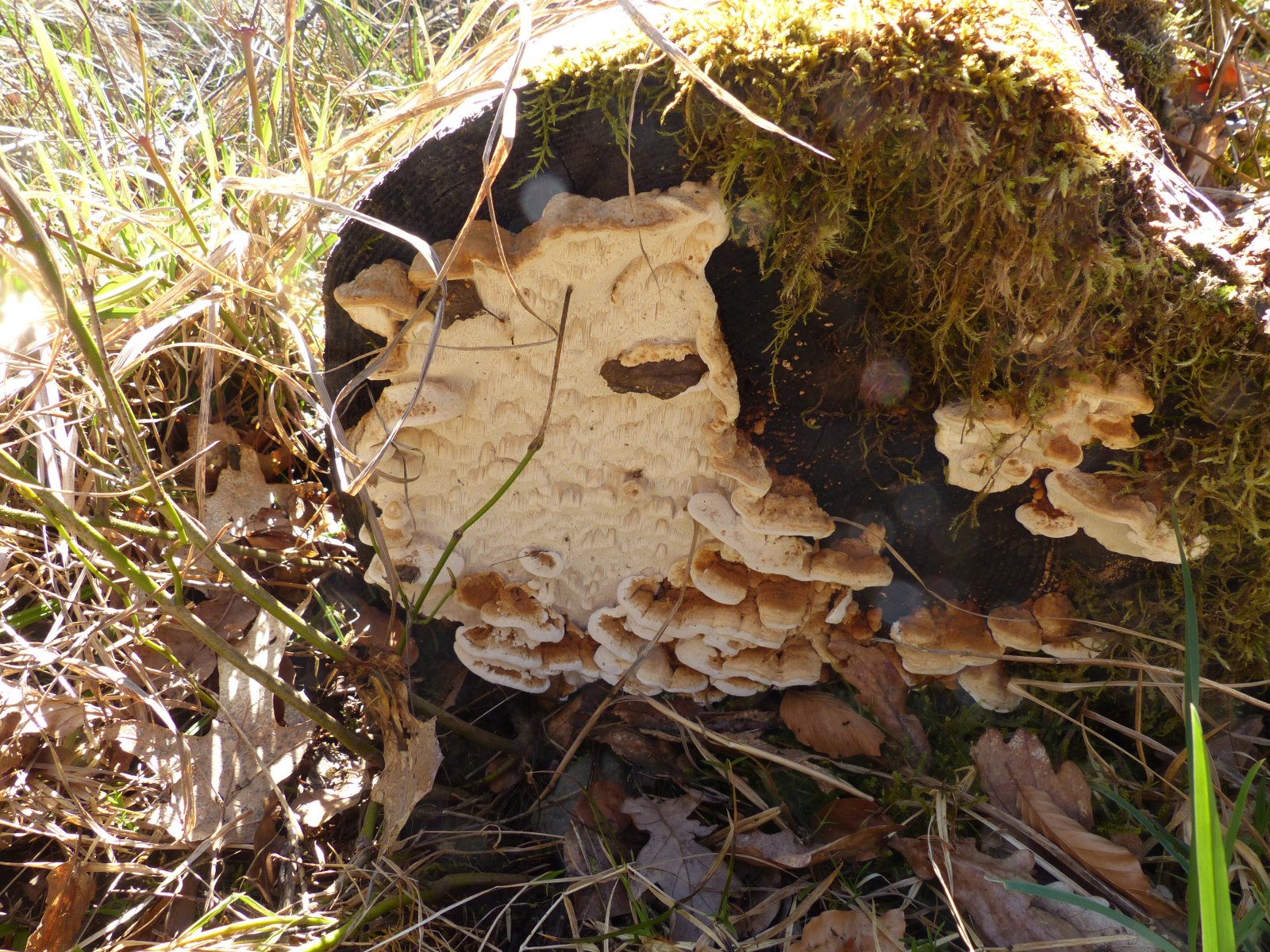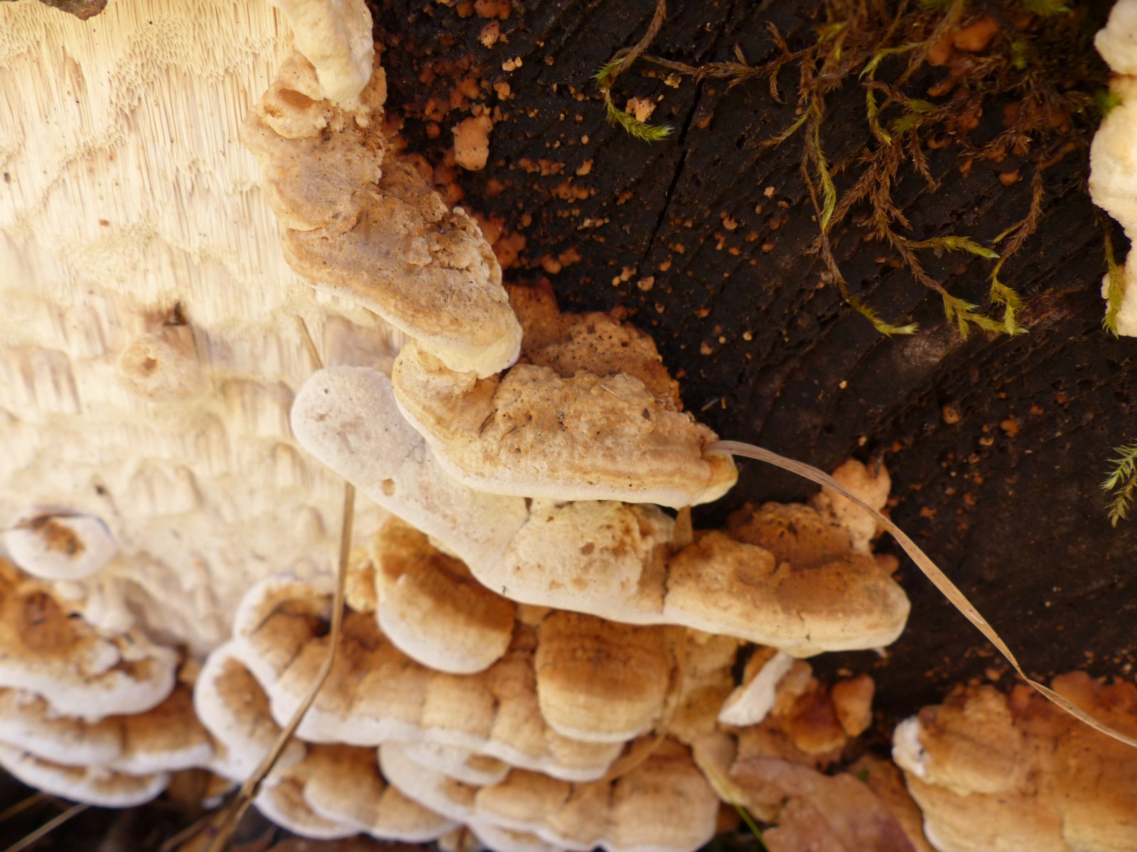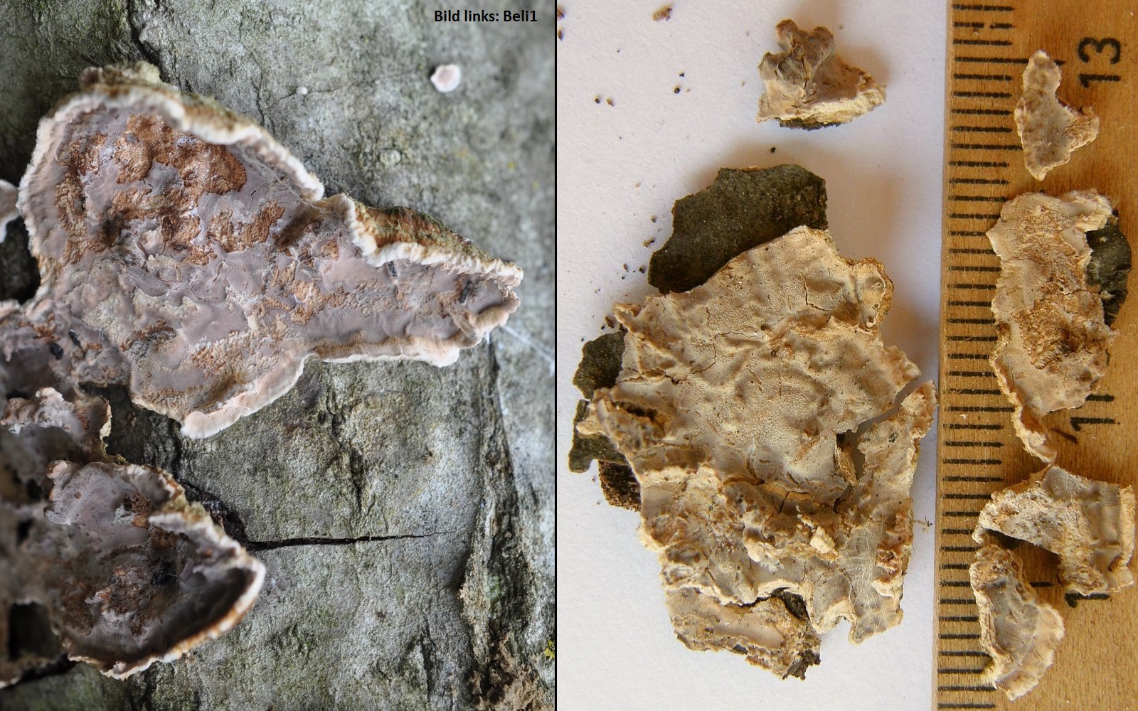 Ich dachte erst an Reihige Tramete, aber der Pilz war fest mit dem Holz verwachsen und ließ sich kaum lösen. Die Reihige Tramete soll sich ja leicht vom Substrat lösen.