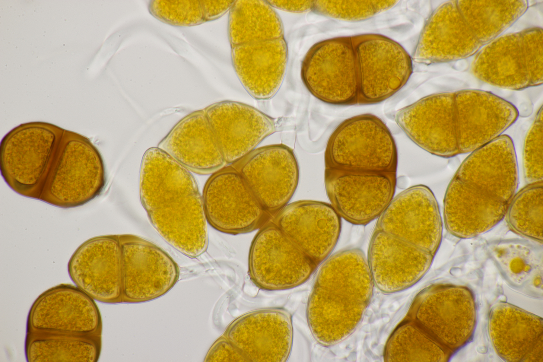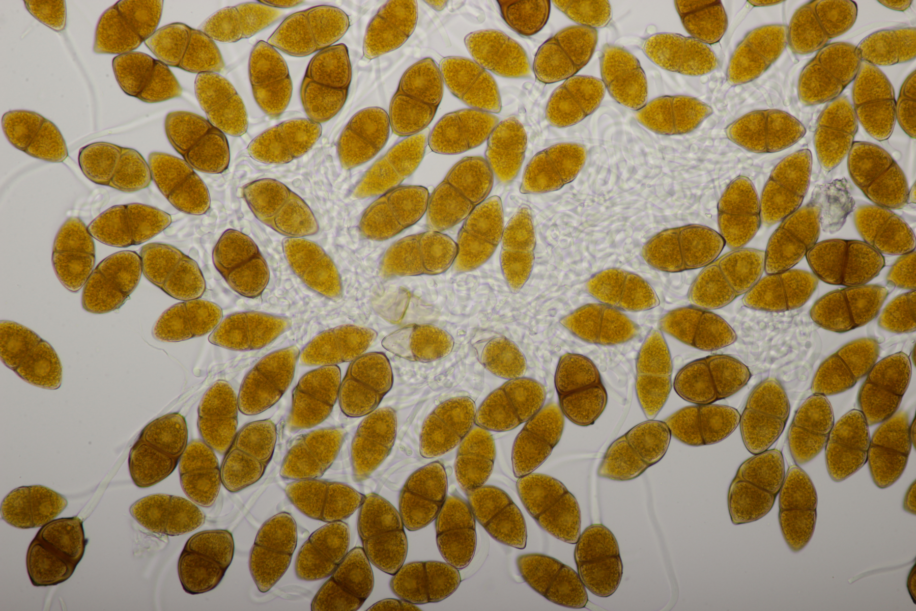 Mikroskopisch zeigen sich schön gelb-orange Teliosporen mit langen hyalinen Stielen: