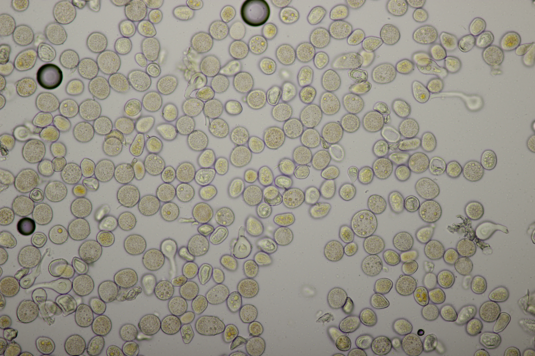 Ich habe mal jetzt die großen Sporen gemessen - also die mit 2 großen Blasen ohne Inhalt.