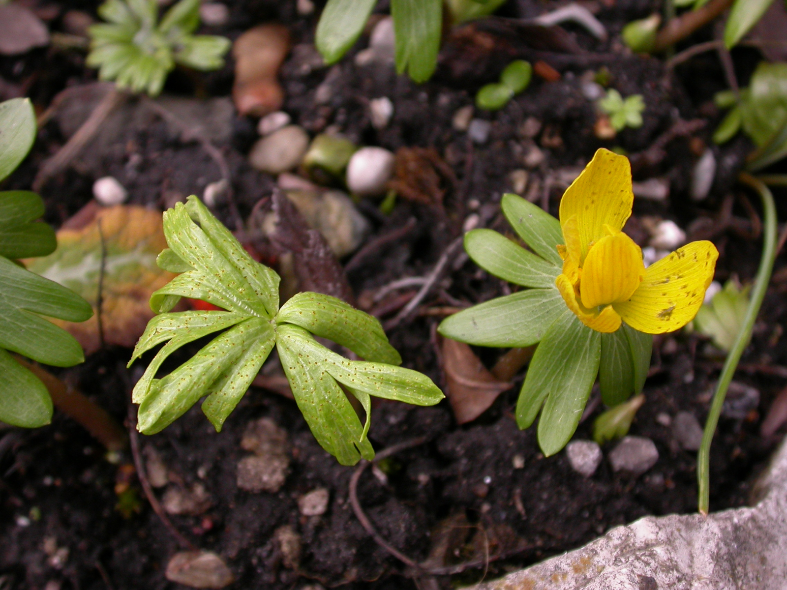 Eher zufällig fielen mir in einer Winterlingspoulation in einem Beet am Straßenrand ein paar etwas anders aussehende Blätter auf.