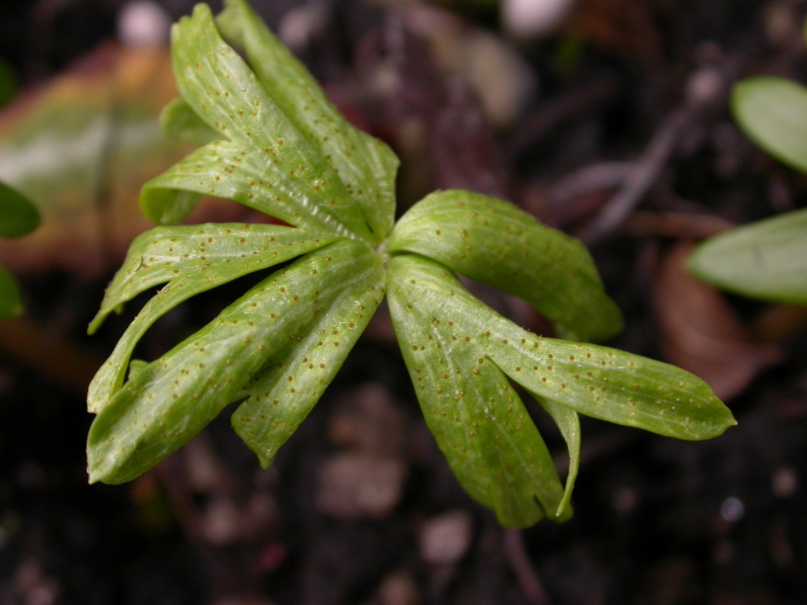 Bei genauerem Hinsehen entdeckte ich die schön verteilten kleinen glasigen Pünktchen auf der Blattoberseite auf, die ich als Spermogonien deutete.