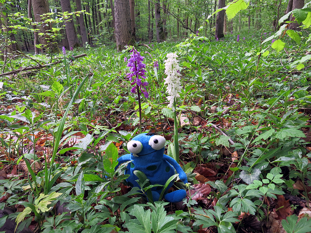 . Also bin ich wieder raus in den Wald und habe Euch noch 3 Fotos mitgebracht.Das erste gefällt mir richtig gut. So dicht beieinander habe ich sie in den beiden Farben noch nie stehen sehen: Orchis mascula