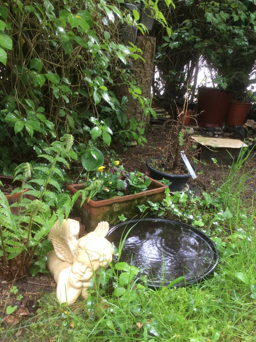 Engelchen bewacht das Vogelbad, in dem die Regentropfen herrliche Wasserkreise zeichnen.