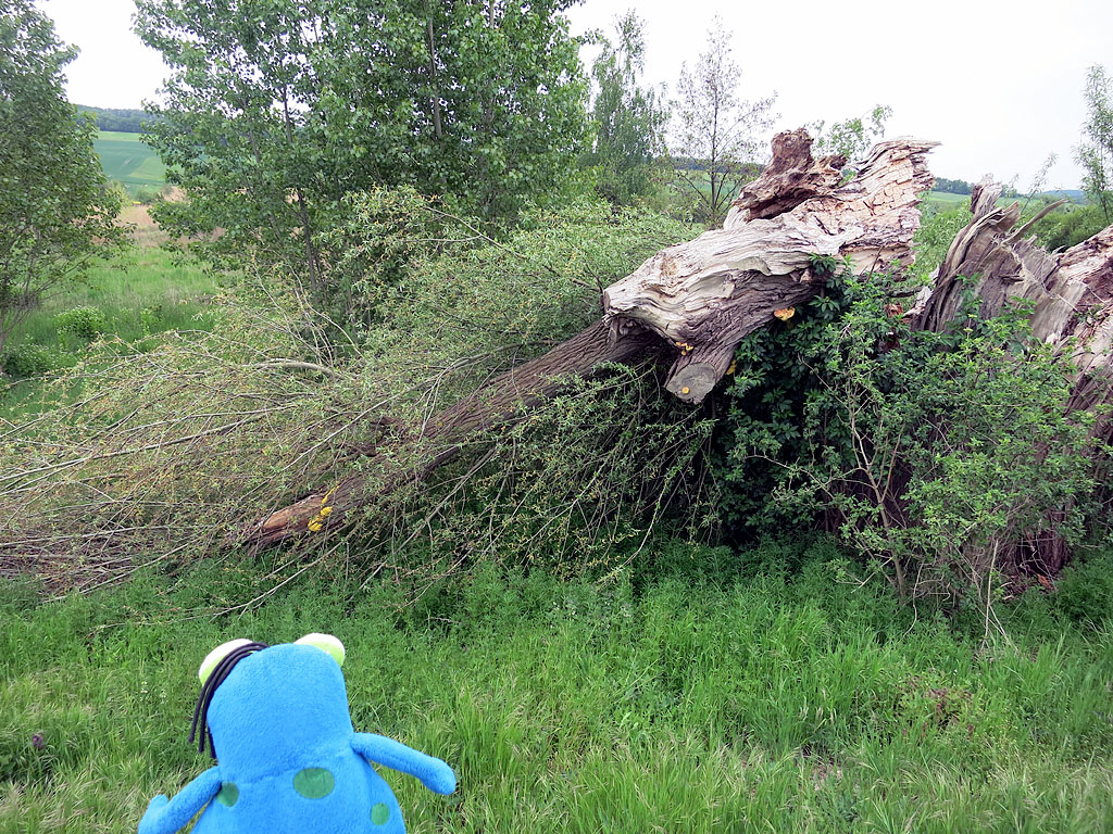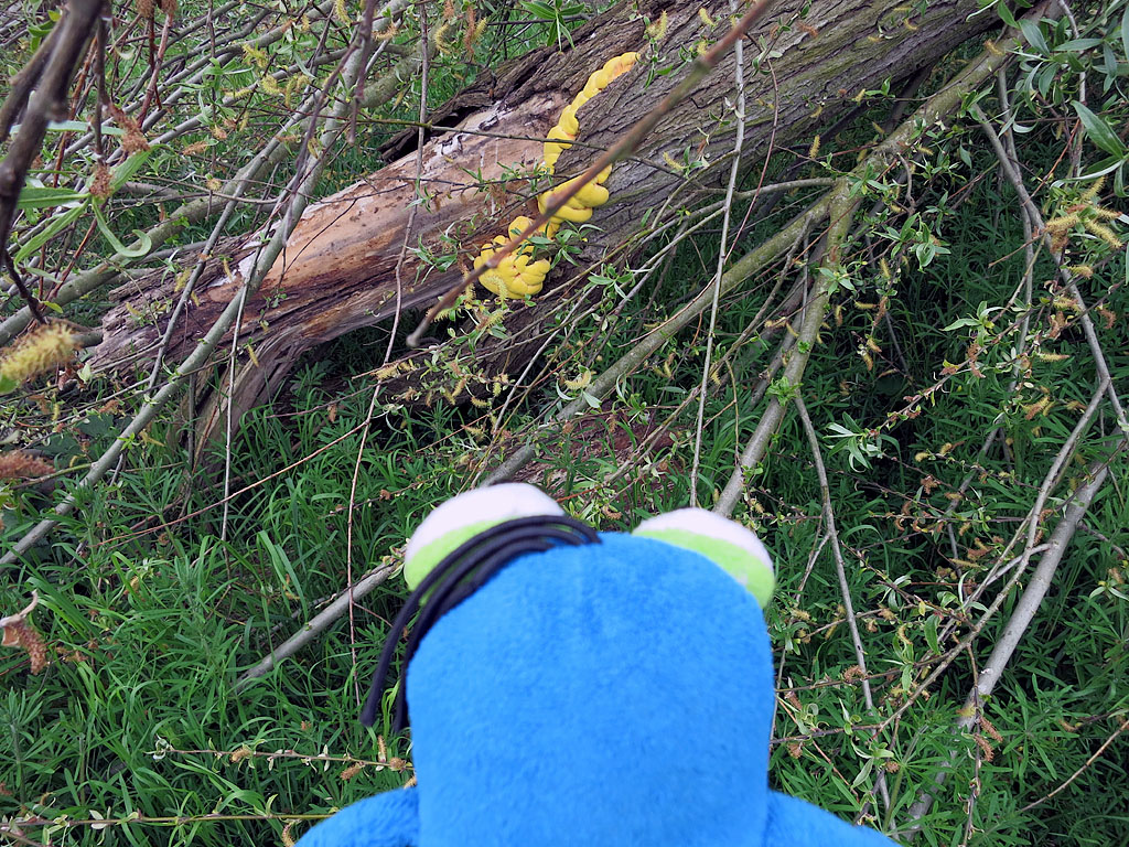Richtig, an einer alten abgebrochenen Weide wächst der Schwefelporling. Ganz jung und knackig. :gstrahlen: Erst habe ich überlegt, mir ein paar Tage später etwas davon für die Pfanne zu holen. Allerdings ist der Uferbereich mit Schwermetallen belastet – und da habe ich mir gedacht: Murph, egal wie lecker er aussieht – lass ihn hängen – man weiß ja nie. :gkopfkratz: