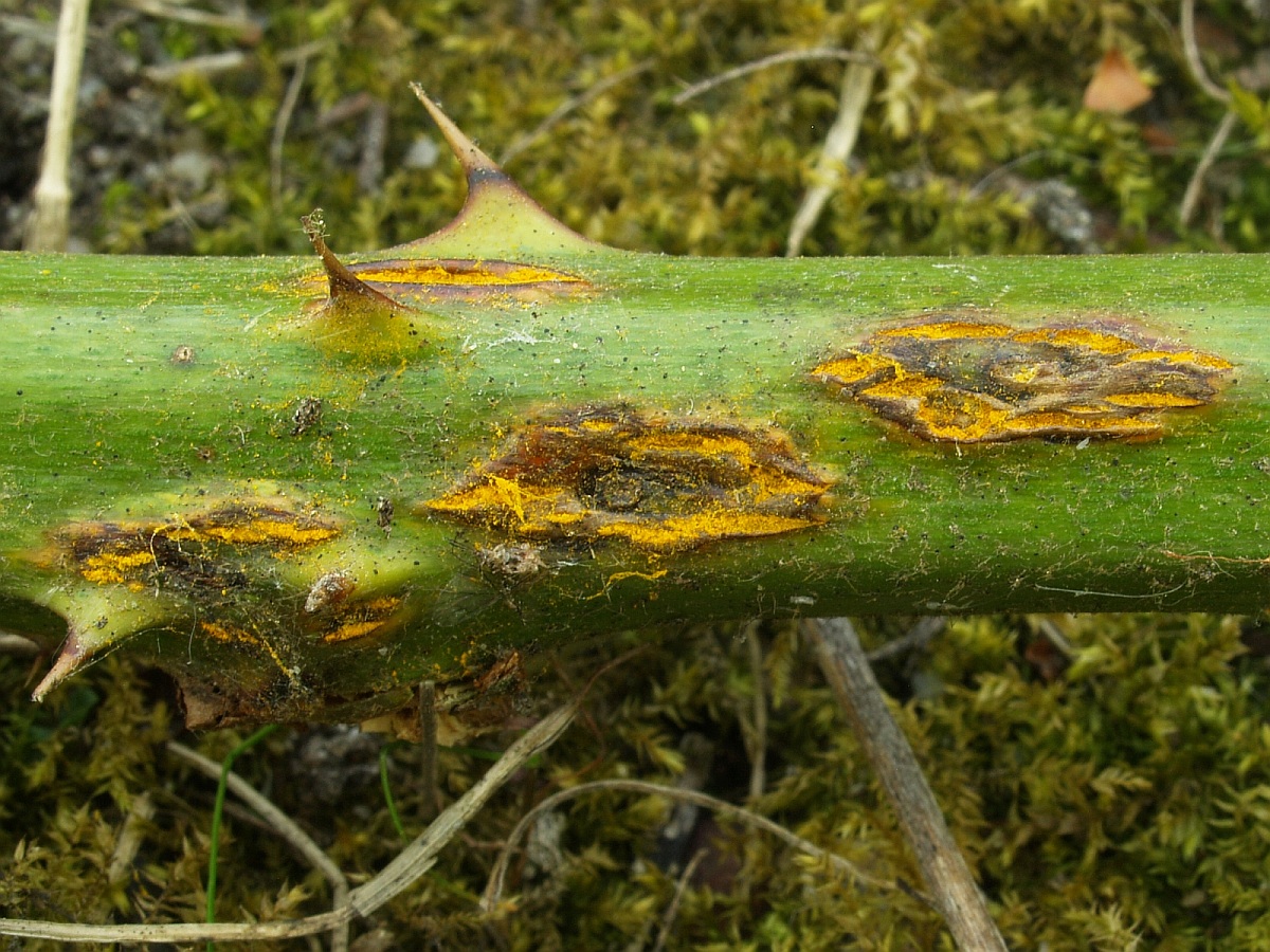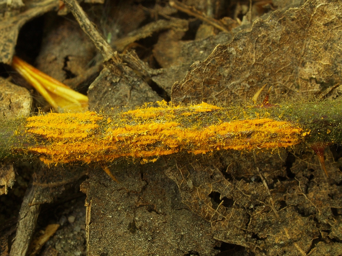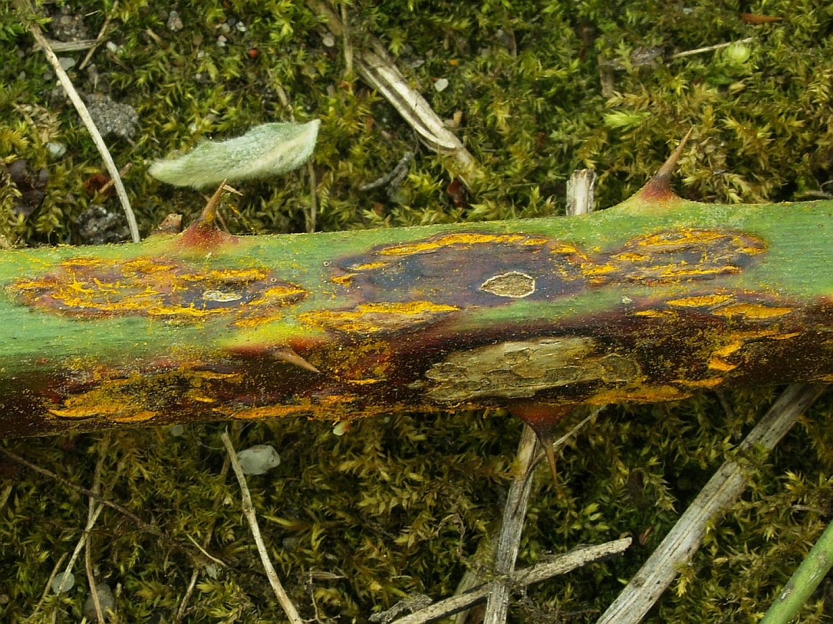 Bei dem Blatt handelt es sich um Giersch (Aegopodium podagraria) und der einzige Rost an Giersch macht nur braune Telien, was mich natürlich zum Absuchen der Umgebung veranlasst hat. Björn und Stefan waren auf der richtigen Spur. Verursacher war eine Brombeerranke, die komplett befallen war. Durch den starken Wind ist das dünne Ende wohl einmal über den Giersch gestrichen und hat voll abgeladen
