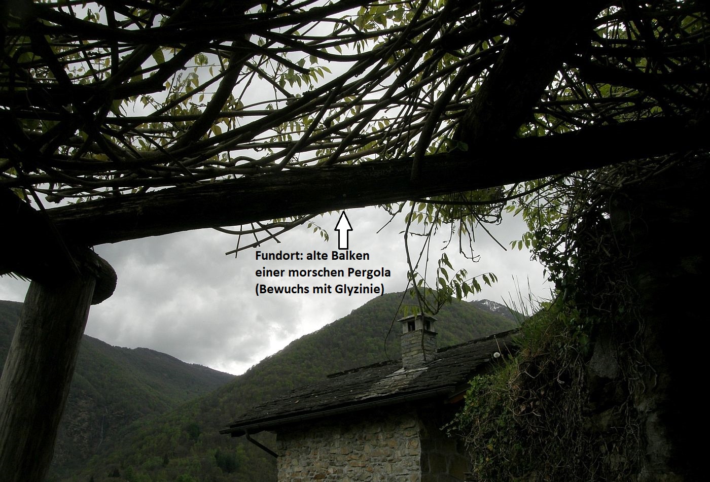 Fundort: Italien, Piemont, Novara, Valle Cannobina / Falmenta an stark verwitterten Balken (Esskastanie) einer alten Pergola. vergesellschaftet dort unter anderem mit Terana caerulea.