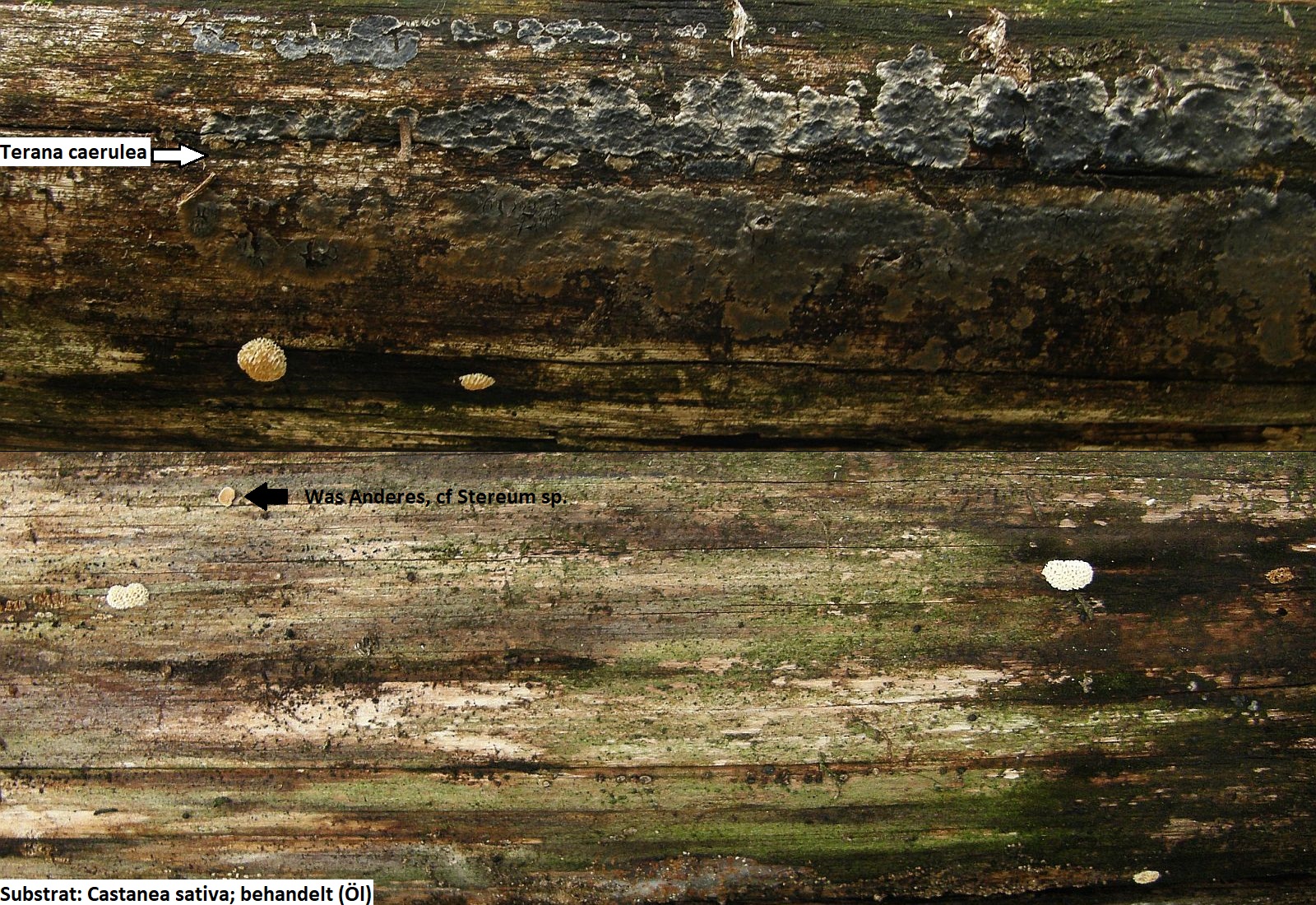 Mittlerweile denke ich, daß das irgednwie zu Antrodia macra s.l. gehören könnte - aber das Substrat ist nicht Weide, noch nicht mal Pappel - jedenfalls haben wir das Holz für die pergola vor ein paar hundert Jahren als Esskastanie gekauft, und es verhält sich auch wie Esskastanienholz, daß vor ein paar Dutzend Jahren zuletzt auch mal eingeölt worden war.