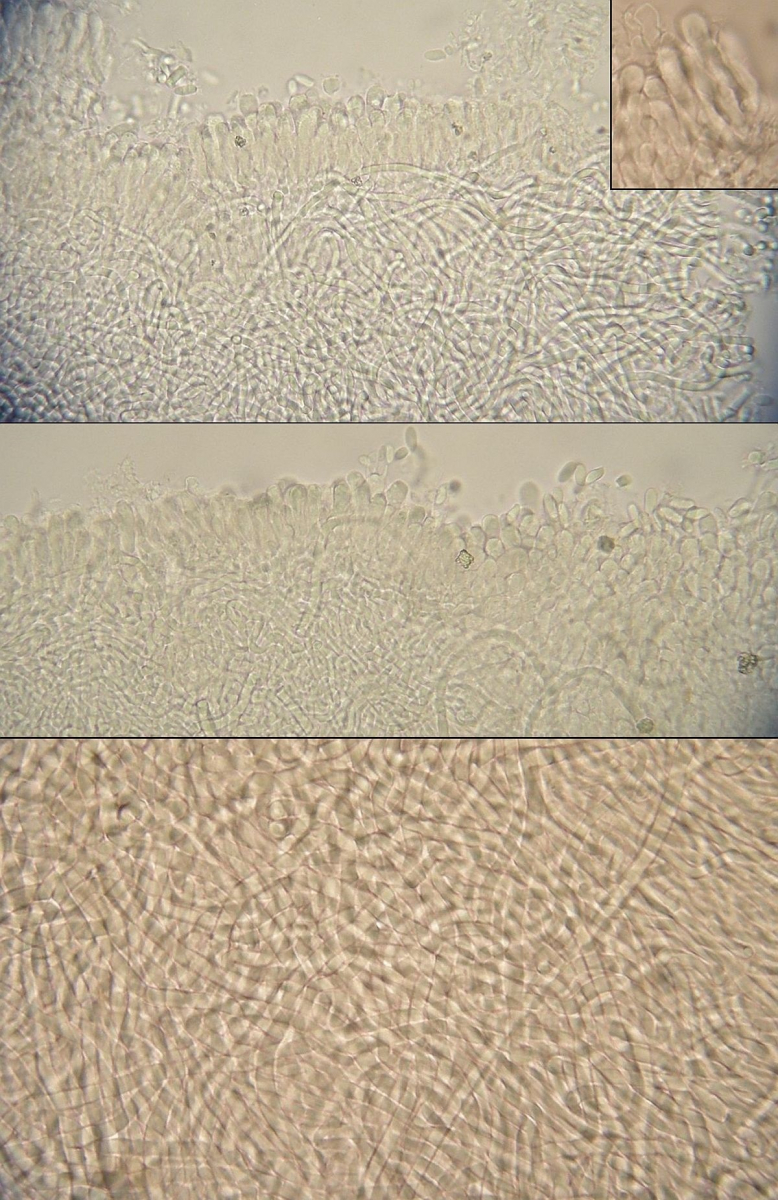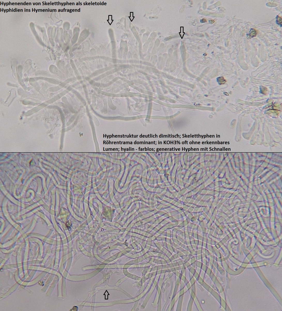 Trama und Subikulum dimitisch, Skeletthyphen in beiden Strukturen dominierend, in KOH3% oft ohne erkennbares Lumen; farblos (nicht ockerlich / bräunlich); keinerlei Reaktionen mit Melzer