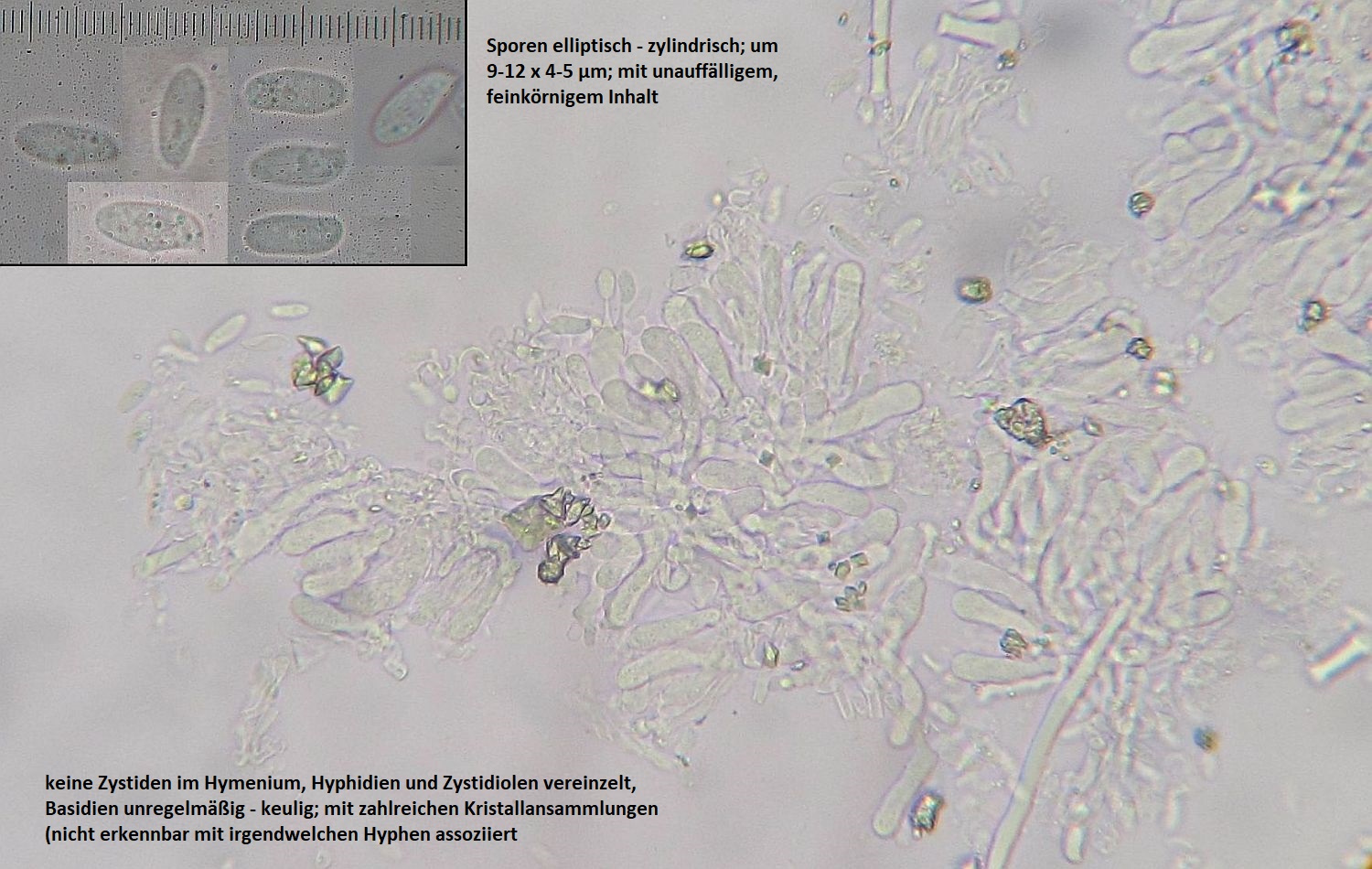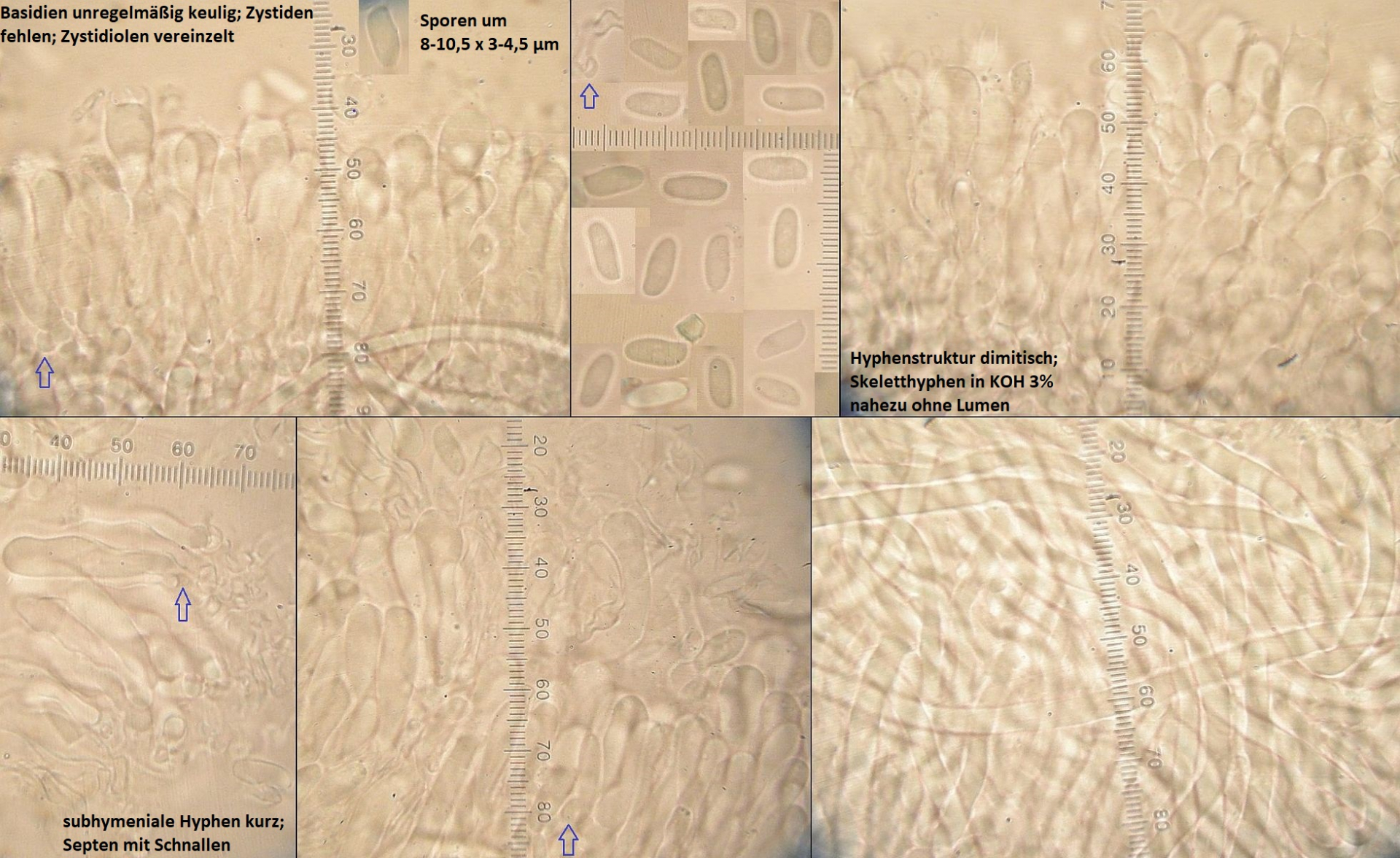 Sporen aus Exsikat in KOH 3% um 8-10 (10,5); keine Zystiden, keine skeletoiden Hyphidien beobachtet; Zystidiolen selten; Basidien keulig, ohne signifikanten Inhalt; Septen der generativen Hyphen mit Schnallen.