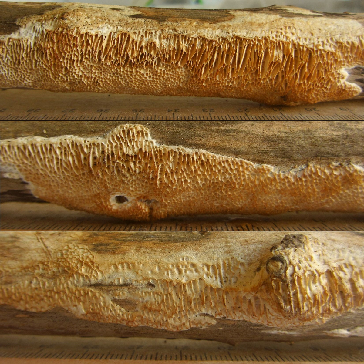 Die typische Antrodia heteromorpha hatte ich erst zwei Mal in der Hand (beides Zusendungen, also noch nie frisch am Fundort beobachten können), die scheint mikroskopisch sehr ähnlich zu sein, aber eben außer der anderen ökologischen Amplitude (eher kühles Klima und in autochthonen Fichtenbeständen) auch noch etwas gröber und unregelmäßiger in der Form des Hymenophors / Poren.
