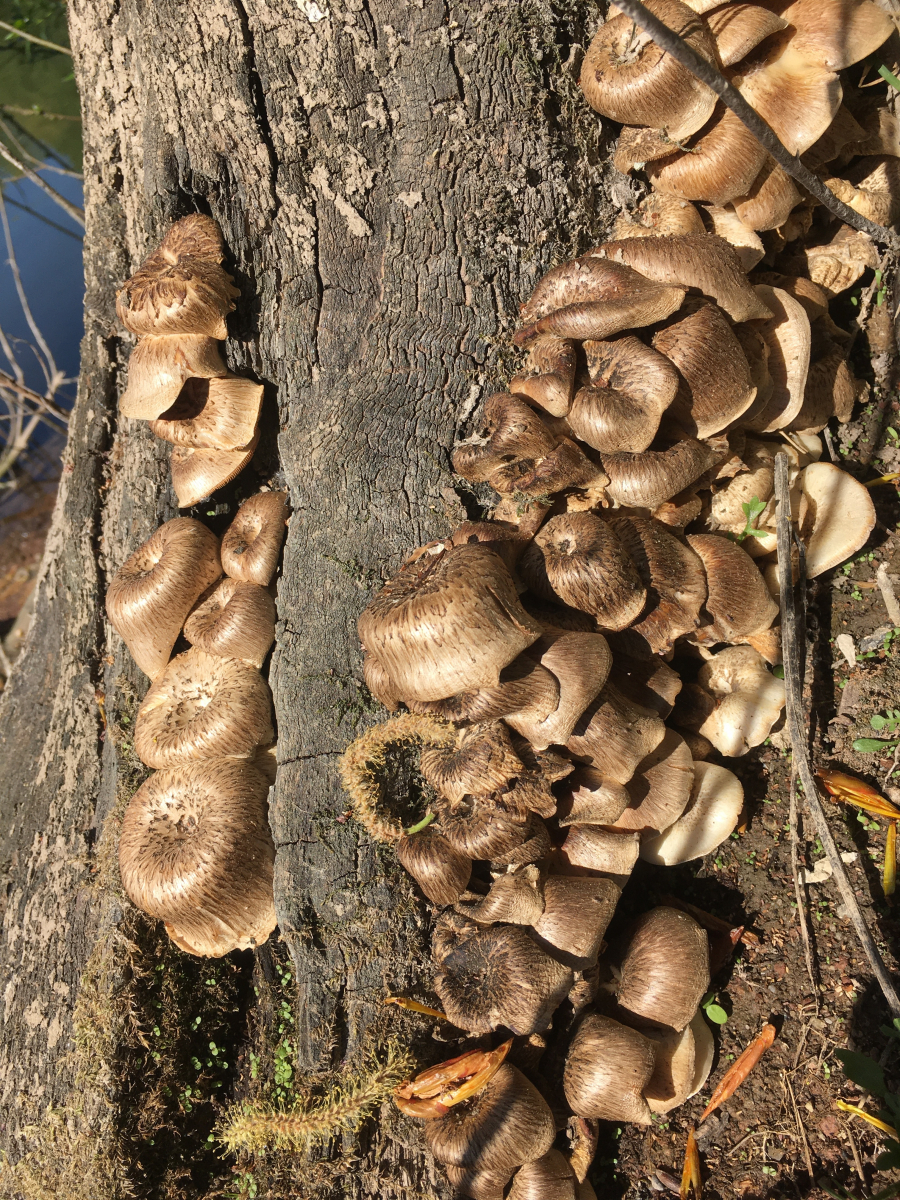 • Bon soir! an einer Gruppe alter, teilsentrindeter, jedoch noch stehender Weiden, fand ich im normalerweise überschwemmten, derzeit aber trockenliegenden Stammbereich diese dicht gedrängten Gesellen. Die Trockenheit hat auch ihnen zugesetzt, daher habe ich versucht noch die frischsten Exemplare herauszusuchen. Größe ca 4-6cm Hutdurchmesser, ca 3-4cm Stiel, ca 0,5 cm dick, sehr fest verwachsen/wurzelnd. Hut und Stiel gelbbraun mit dunkel braunen faserigen Schuppen. Hut glockenförmig (Trockenheit) eingerollt, genabelt. Bei Feuchtigkeit möglicherweise trichterförmig. Die Stielbeschaffenheit ist nur zu erahnen, sie haben etwas gelitten aufgrund der rohen Gewalt, die ich ohne Messer aufwenden musste um die drögen Burschen herauszureissen. An der Basis verjüngend. Fleisch sehr zäh, vliesartig. Lamellen cremeweiss,bei alten FK bräunlich, herablaufend, leicht gesägt. Sporen jedoch weiss (auf dem dunklen Holz gut zu erkennen). Geruch pilzig, evlt im Abgang etwas mehlig, aber nicht sonderlich unangenehm. Es sollte schon ein Stielporlingsverwandter sein - ich wäre am ehesten bei L. tigrinus- gibt es Gegenvorschläge?