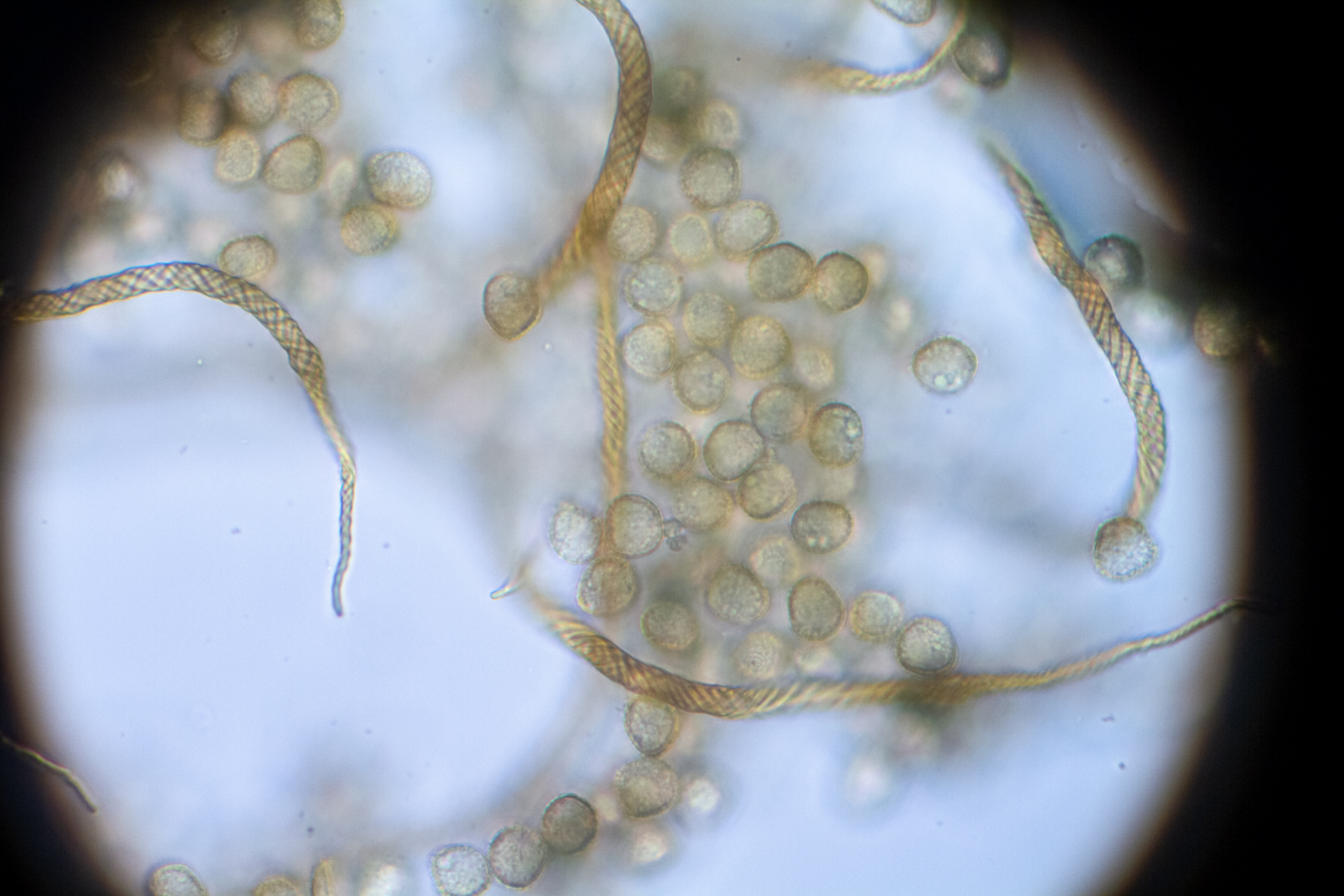 Die Sporen sind +/- 10 µm und haben ein Netz (oder doch unregelmäßig verteilte Warzen?).