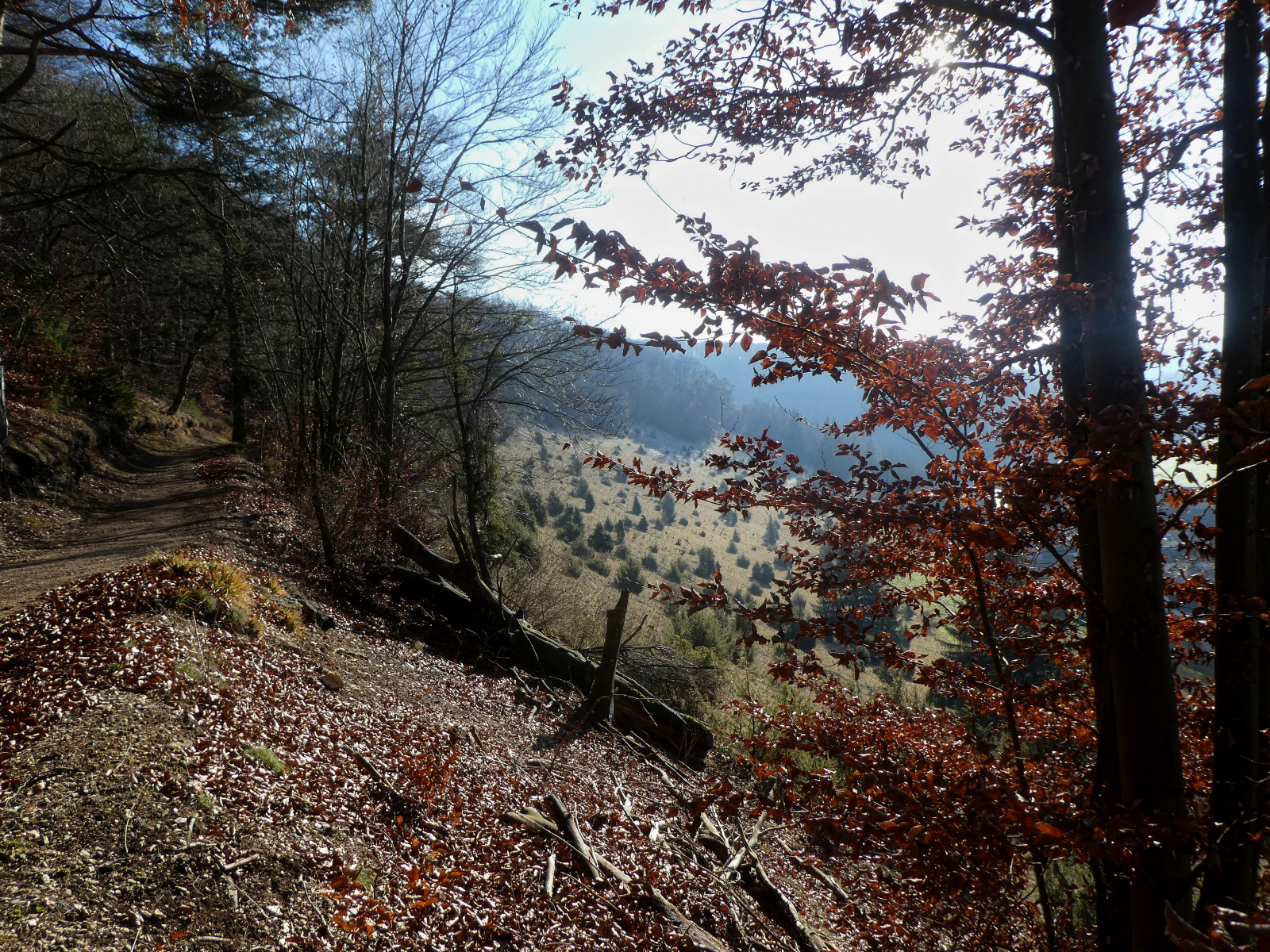Auf der einen Seite des Weges war lichter Rotbuchenwald, durchsetzt mit Felsen wie man vielleicht im Hintergrund erahnen kann.