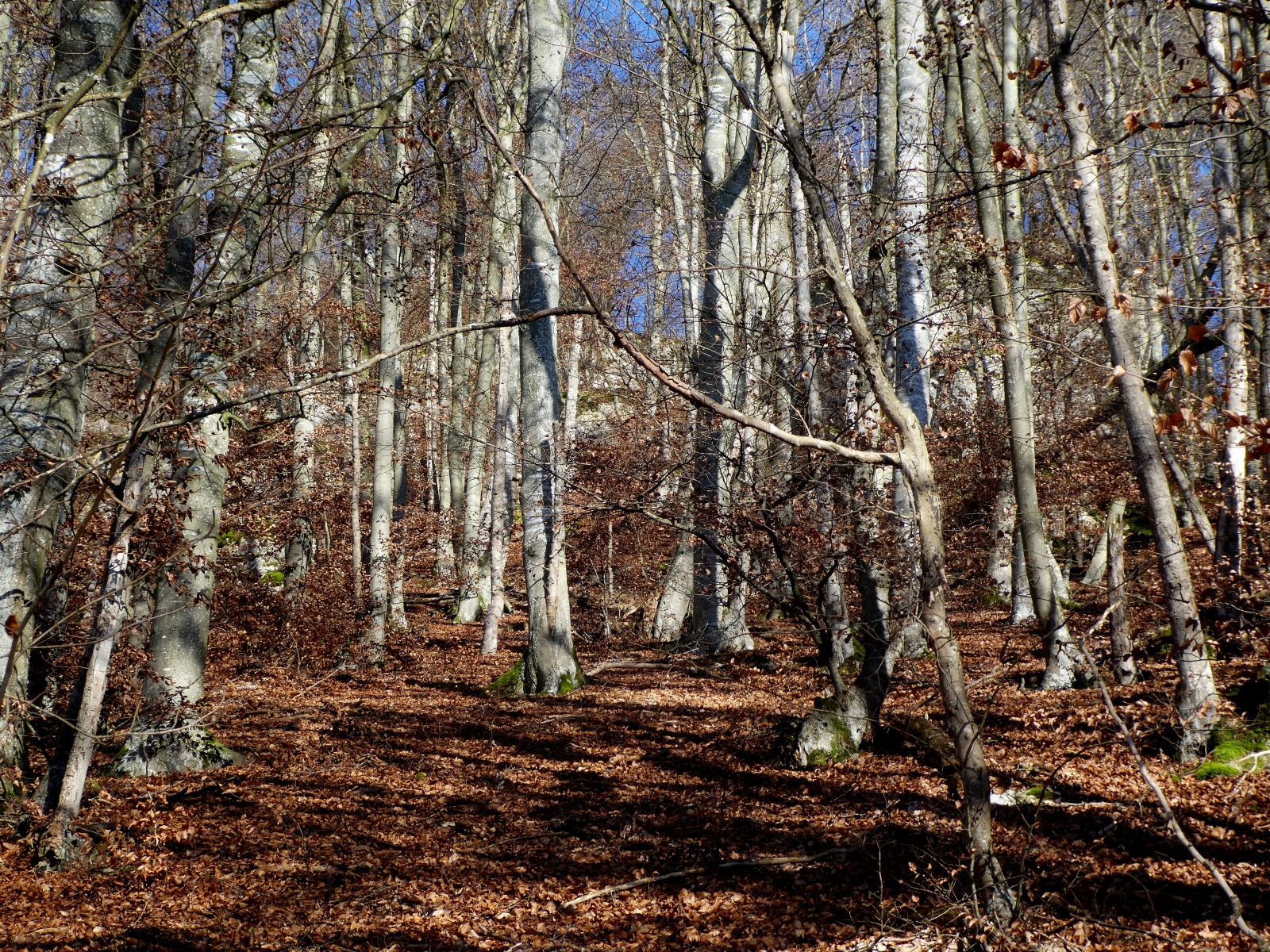 Auf der einen Seite des Weges war lichter Rotbuchenwald, durchsetzt mit Felsen wie man vielleicht im Hintergrund erahnen kann.