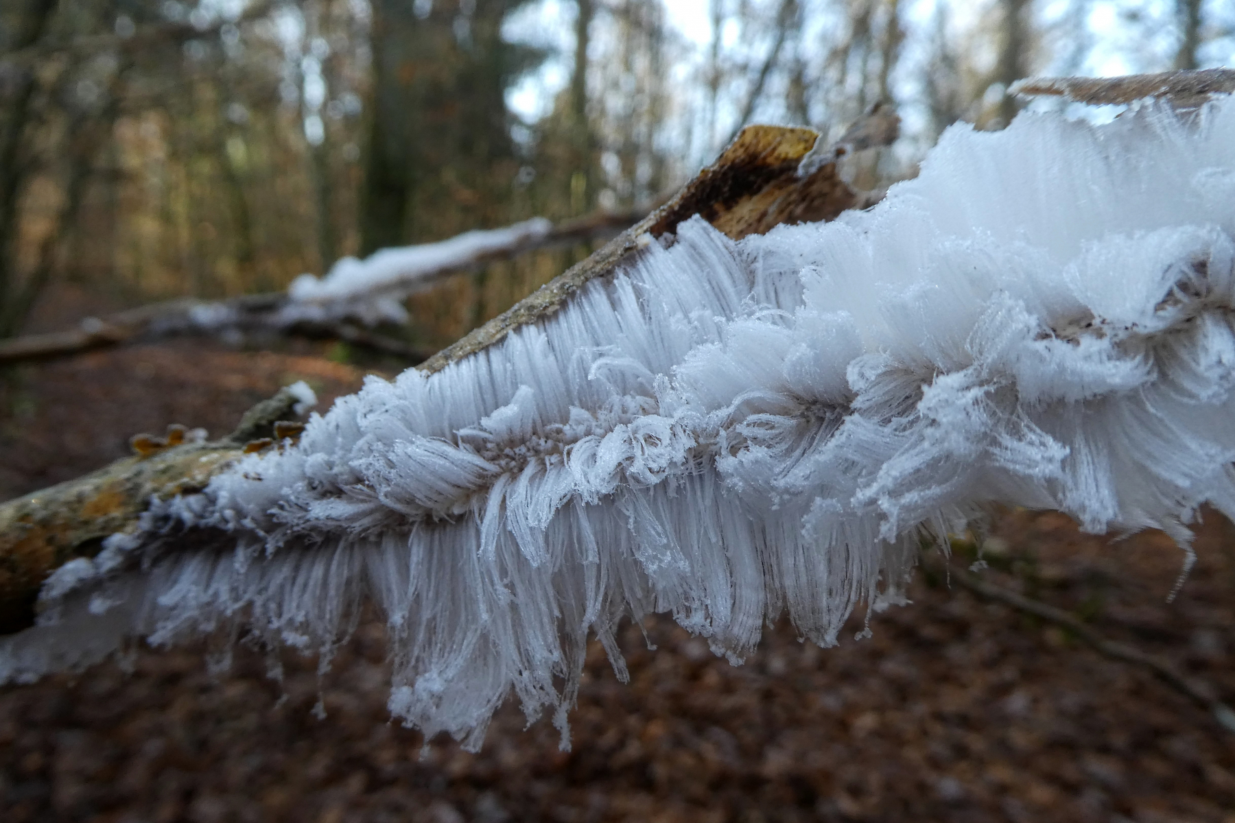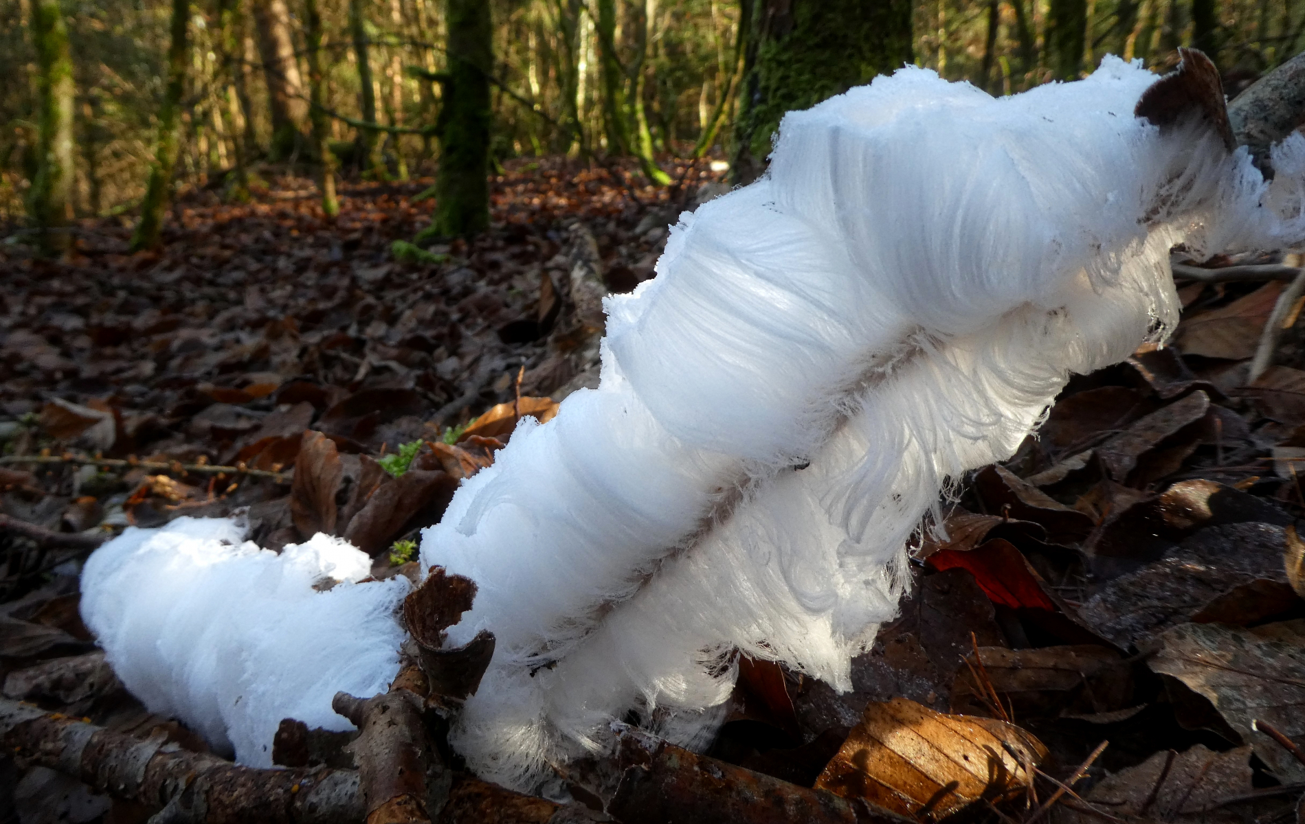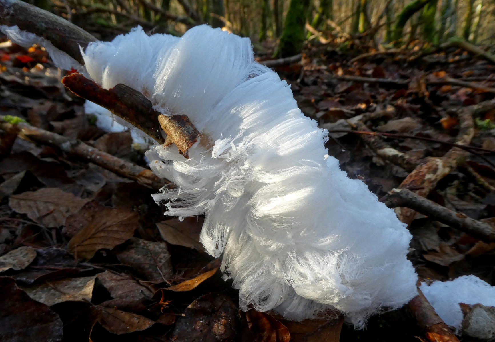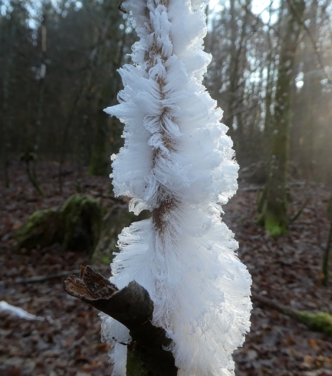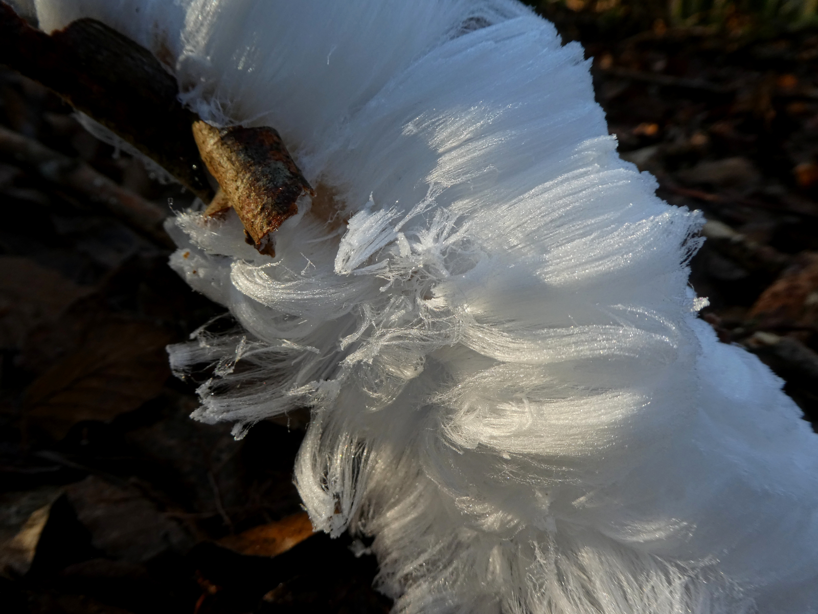 Dies war am 06. Januar unglaublich. Ungefähr einen halben Kilometer lang rechts und links des Weges war alles voll mit Haareis! Hunderte von Ästen und Stümpfen mit Haareis bedeckt, wohin man sah.