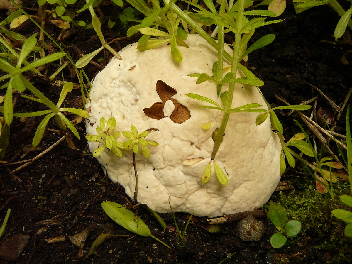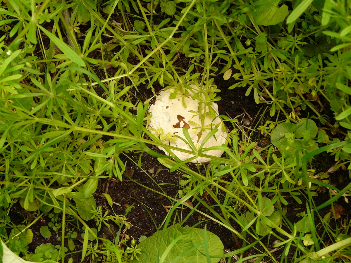 Nachdem es endlich wieder mal geregnet hat, brach ich zu einer kurzen Runde auf. Aus einigen Metern Entfernung leuchtete es weiß zwischen dem üppigen Bewuchs hervor. Das kann ja um diese Zeit fast nur der Mai-Ritterling (Calocybe gambosa) sein und in Erwartung weiterer Exemplare ging ich näher. Aus der Nähe leichte Enttäuschung über ein Einzelexemplar. Gewöhnlich wächst der Mai-Ritterling gesellig und auch wegen der etwas unebenen Oberfläche kam ein erster Zweifel auf, aber nach der langen Trockenheit war ja fast Alles möglich.