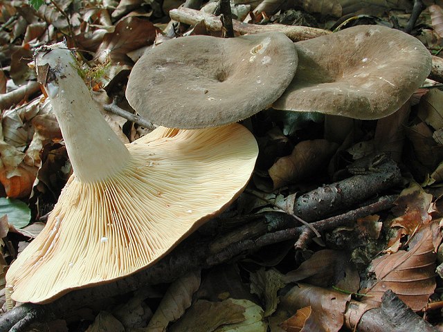 Ich fand heute einen Milchling im Mischwald, vorwiegend Buchen, aber auch Eichen und eingestreute Lärchen über Kalk. Der Hut war recht dunkelbraun, samtig. Die Milch war schärflich und bei Druck auf die Lamellen verfärbten diese sich rosa. Wenn es der Rosaanlaufende Milchling(L.acris) wäre, müßte sich ja laut Literatur die milch innerhlab Sekunden rosa verfärben. Wie man auf dem Bild sehen kann, ist die Milch aber noch weiß (auf den Lamellen zu sehen)und nach dem hinstellen das Fruchtkörpers und knipsen des Bildes sind ja doch 1-2 Minuten ins Land gegangen. Daher denke ich an recht dunkle Exemplare vom Rauchfarbenen Milchling (L.azonites). Was meint ihr dazu?