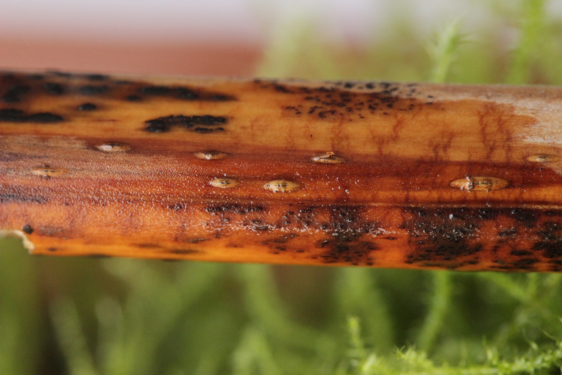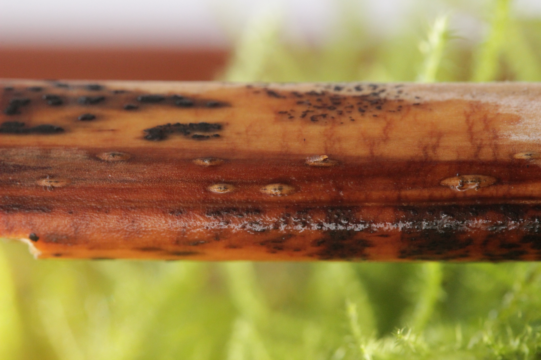 ich hatte hier in einer feuchten Kammer noch ein Stückchen abgestorbenen Adlerfarn aus dem Duisburger Stadtwald liegen. Gestern Abend habe ich mir das noch mal alles genau mit der Lupe angeschaut und dabei Camarographium stephensii entdeckt. Davon gibt es bis jetzt genau eine Fundmeldung bei Pilze-Deutschland vom letzten Jahr aus Wuppertal. Makroskopisch macht der Pilz einfach kleine Schlitze auf dem Farn. Im Inneren werden dann braune, muriforme Konidien gebildet.