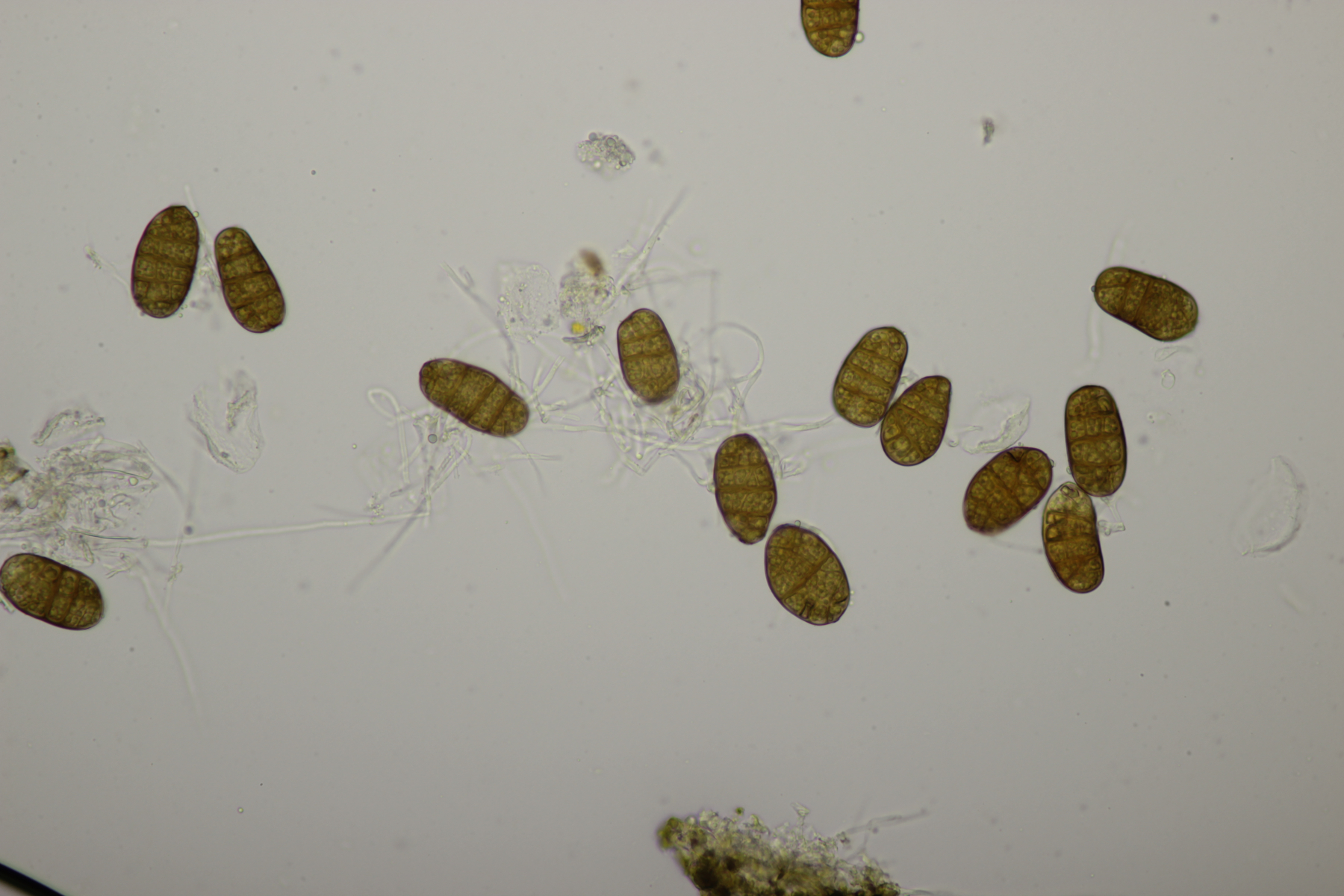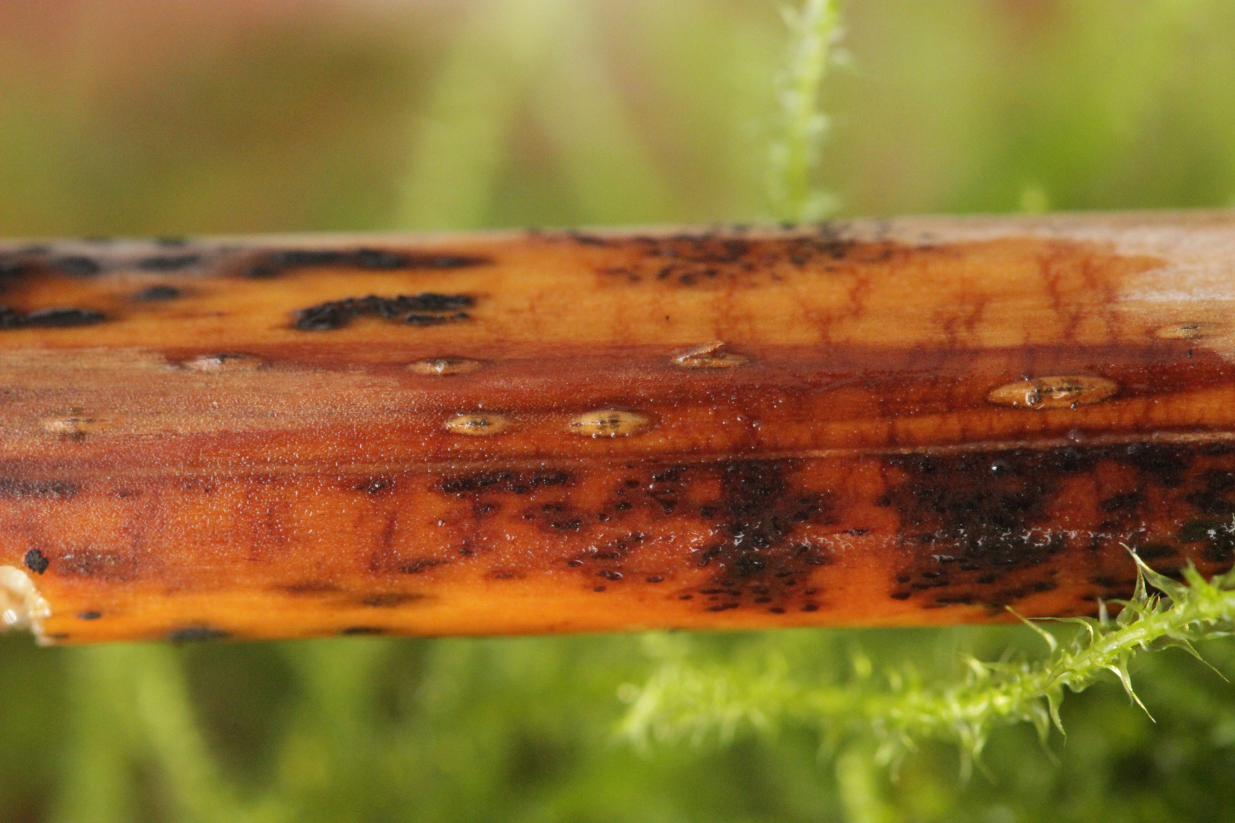 ich hatte hier in einer feuchten Kammer noch ein Stückchen abgestorbenen Adlerfarn aus dem Duisburger Stadtwald liegen. Gestern Abend habe ich mir das noch mal alles genau mit der Lupe angeschaut und dabei Camarographium stephensii entdeckt. Davon gibt es bis jetzt genau eine Fundmeldung bei Pilze-Deutschland vom letzten Jahr aus Wuppertal. Makroskopisch macht der Pilz einfach kleine Schlitze auf dem Farn. Im Inneren werden dann braune, muriforme Konidien gebildet.