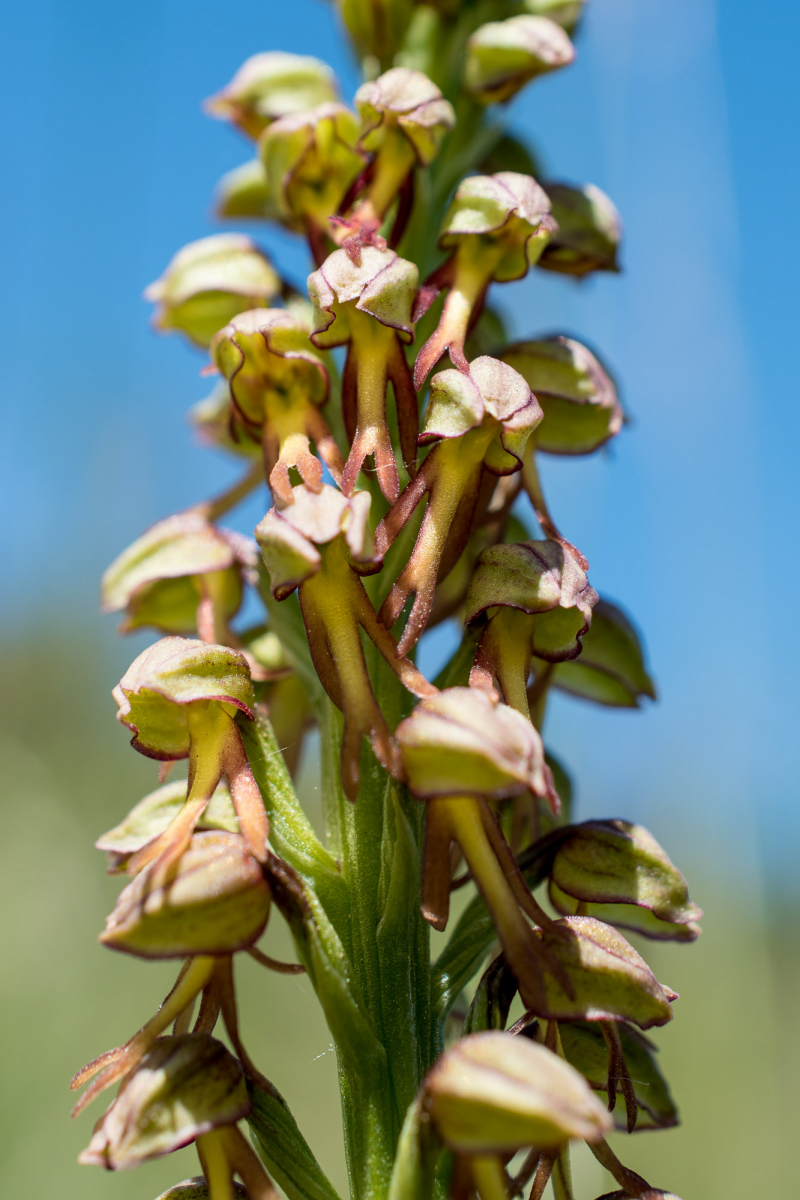bei der Affenorchis öffnen sich die Blüten von oben nach unten. Möglich wäre eine Hybride aus O. militaris und Ohnsporn, aber da müsste man die ganze Pflanze sehen.Hallo Karl, danke für die Detailinfo! Ich hab auch nicht gemeint, daß es eine Affenorchis ist (dazu kenne ich mich zuwenig aus), sie hat mich wegen der kleinen "Männchen" nur daran erinnert.